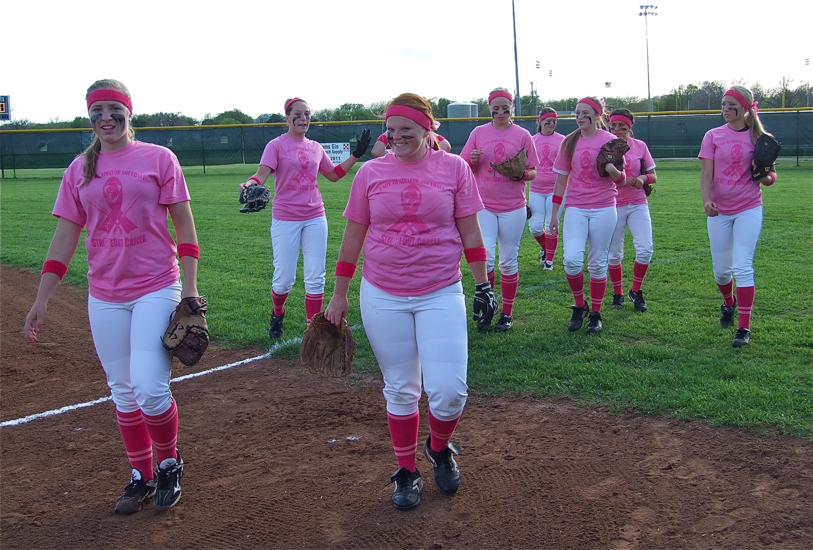 Lady Gladiator Softball helps “Strikeout Cancer” by hosting Pink-out « previous story album next » A field of pink, the Lady Gladiators head in to the dugout. (Barry Byers) Download original photo