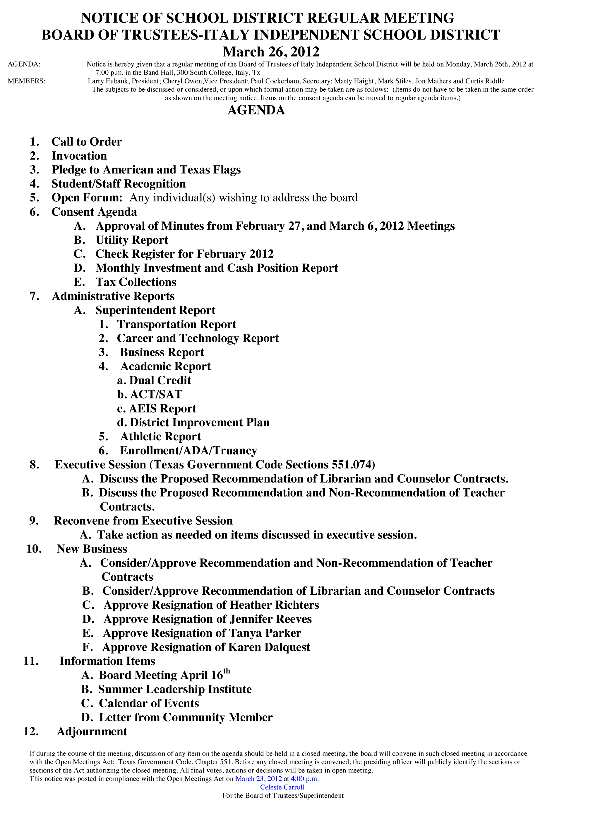Agenda: Italy School Board Meeting, Monday, March 26, 2012 « previous story album next » Agenda Download original photo