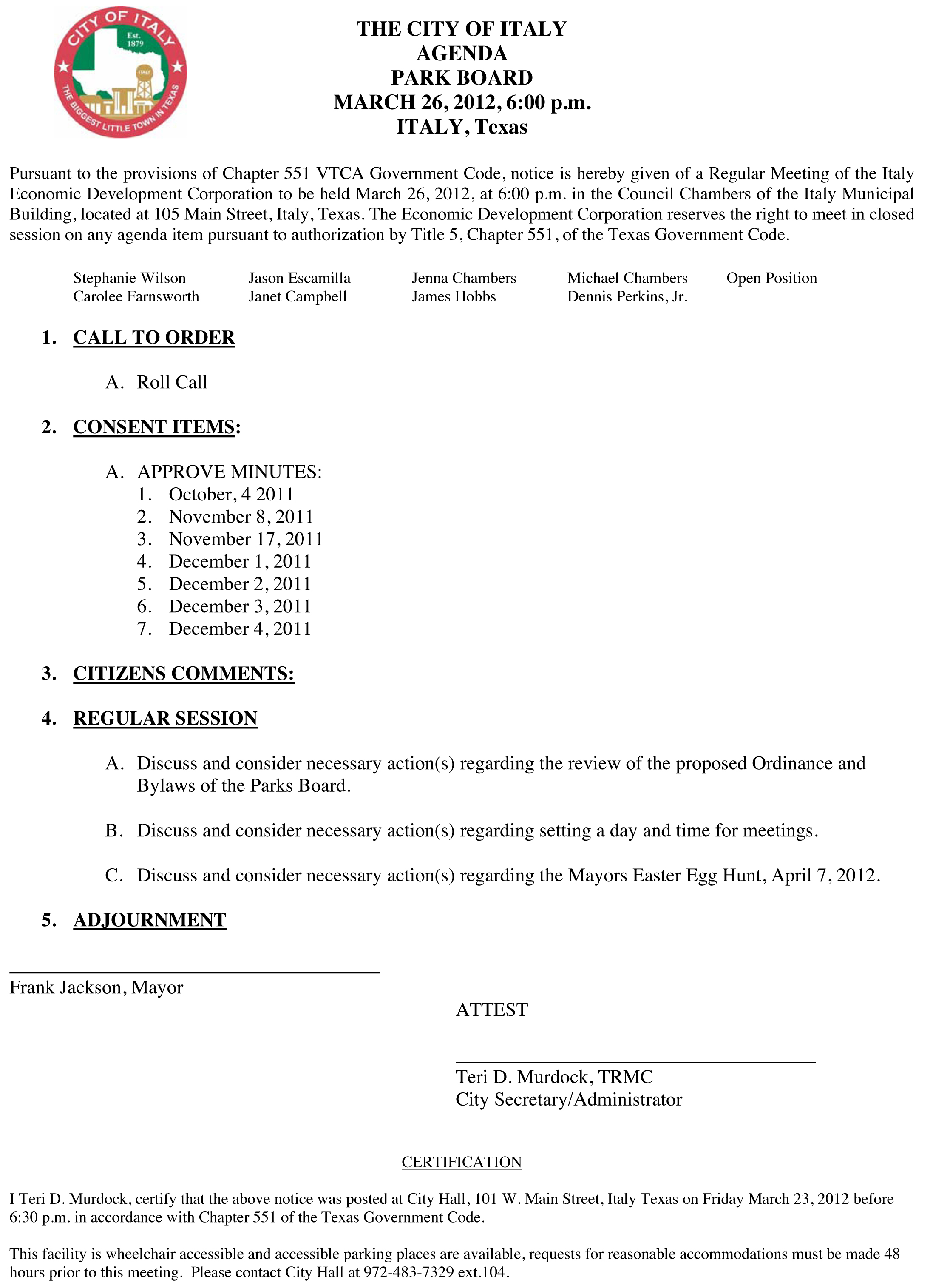 Agenda: Italy Park Board Meeting – Monday, March 26, 2012 « previous story album next » Download original photo