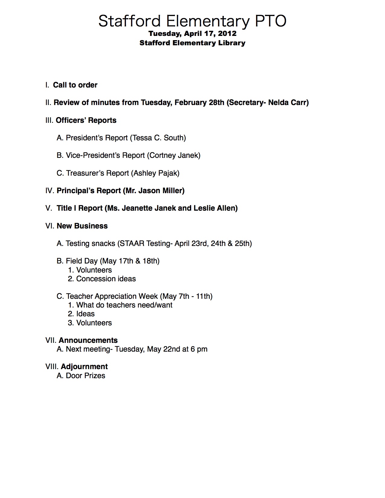 Agenda: Stafford Elementary PTO meeting – Tuesday, April 17, 2012 « previous story album next » Download original photo