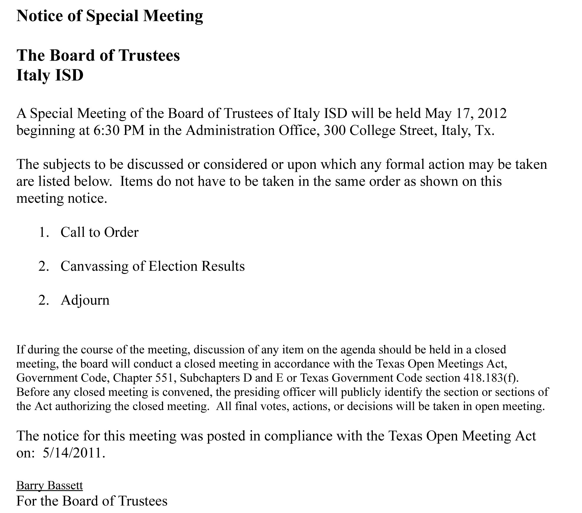 Agenda: Italy ISD School Board Called Meeting — Thursday, May 17, 2012 « previous story album next » Download original photo