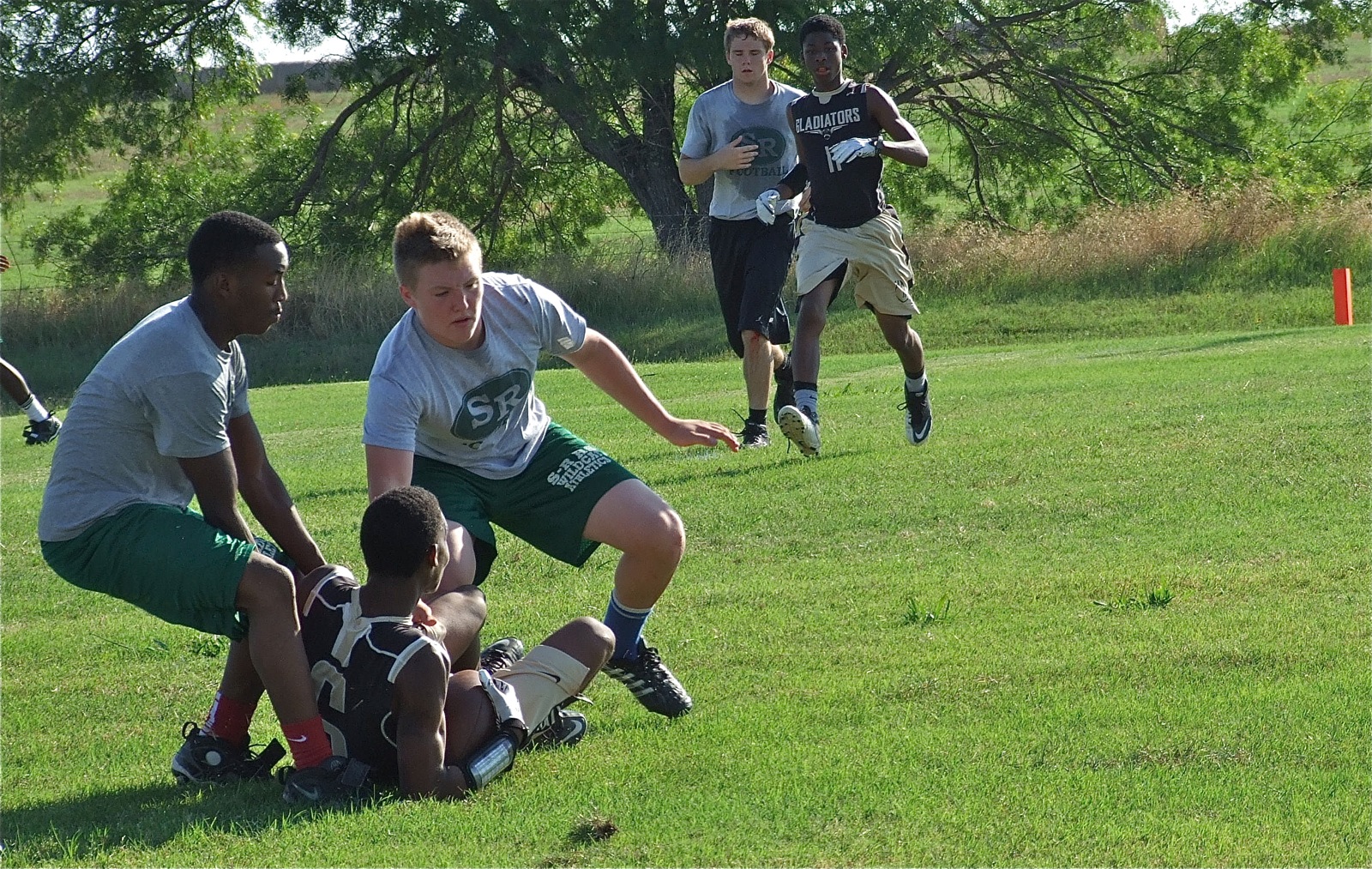 Gladiators take on Scurry-Rosser in 7-on-7 football matchups « previous story album next » Trevon Robertson gets low to make the catch. (Barry Byers) Download original photo