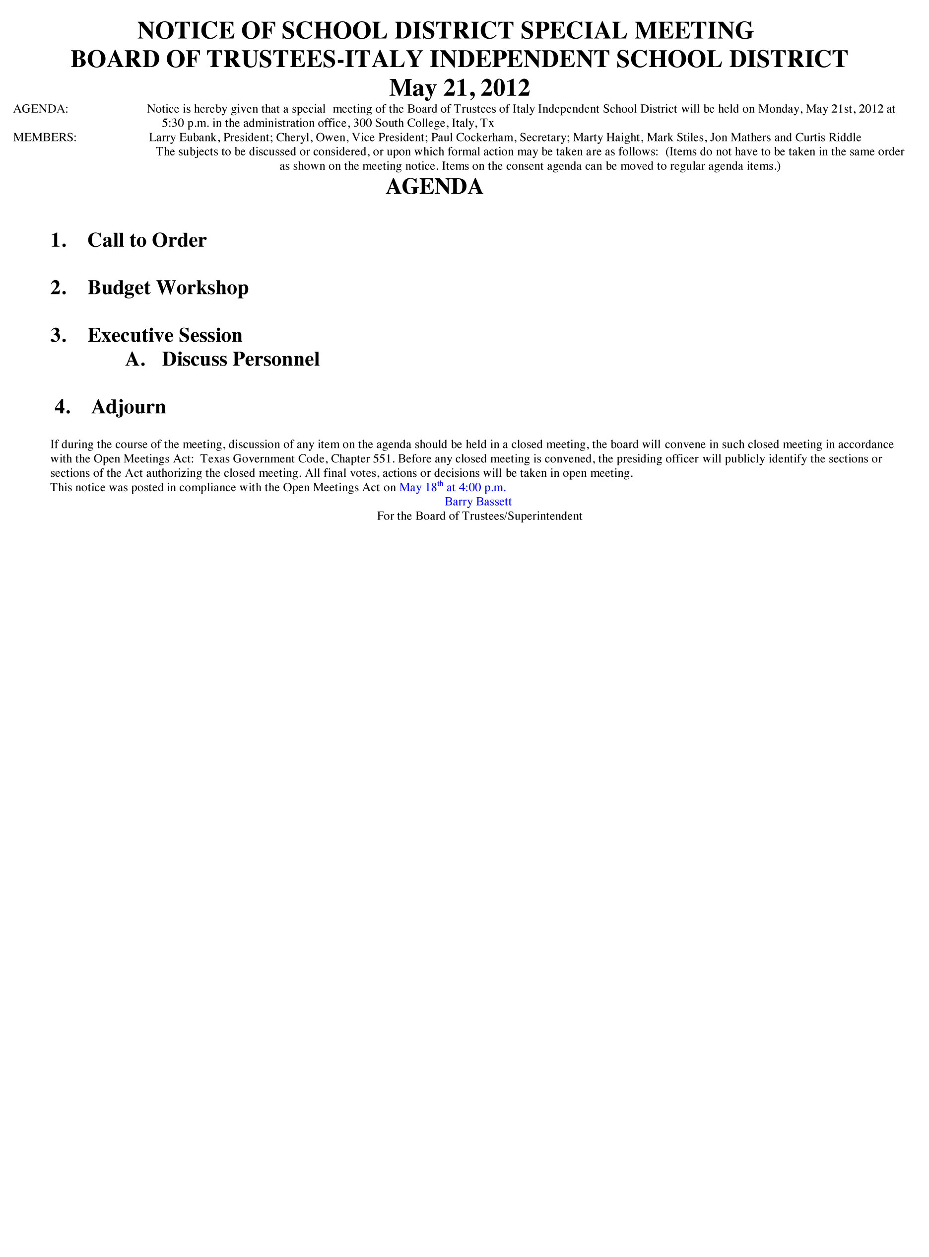 Agendas: Italy ISD School Board Called & Regular Meetings — Monday, May 21, 2012 « previous story album next » Called Meeting – Agenda (Italy ISD Administration Office) Download original photo