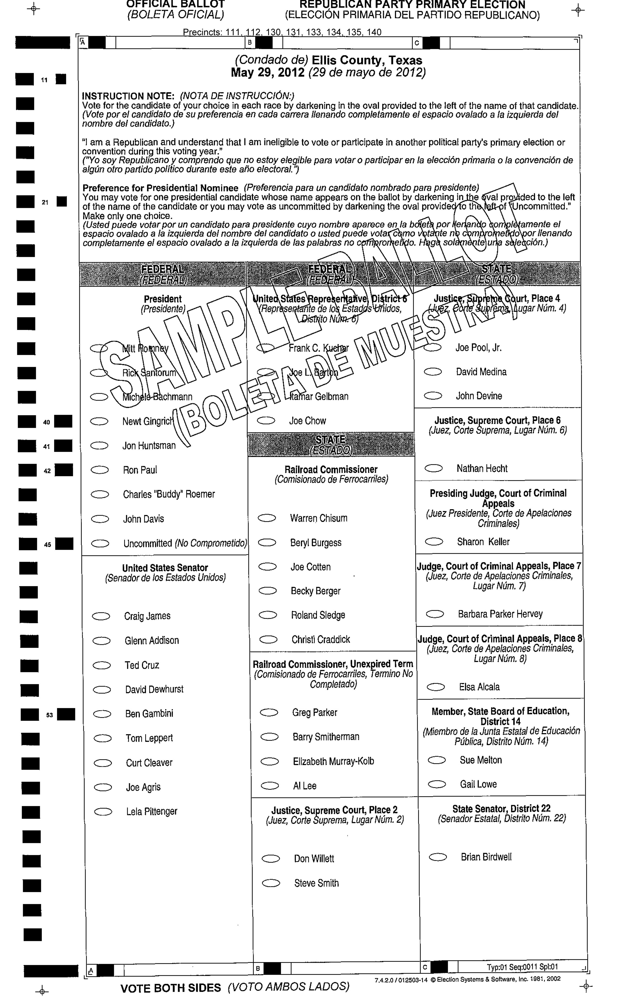 Democratic and Republican Primary — Tuesday, May 29, 2012 « previous story album next » Republican Primary Election-Sample Ballot, page 1 Download original photo