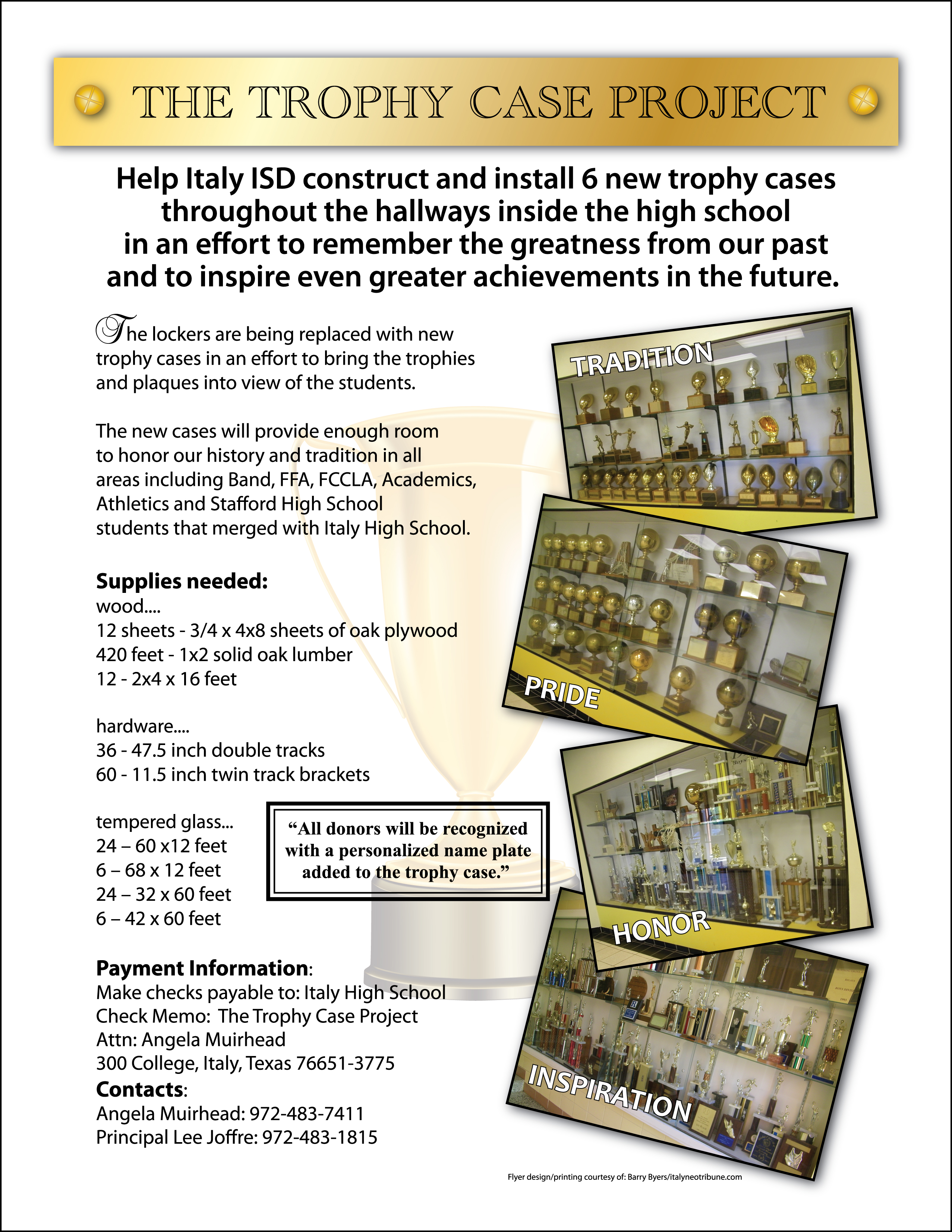 “The Trophy Case Project,” will provide 6 trophy cases to replace lockers along the main hallway inside Italy High School. Donations of $100.00 or more will be recognized with a personalized name plate added to one of the trophy cases.