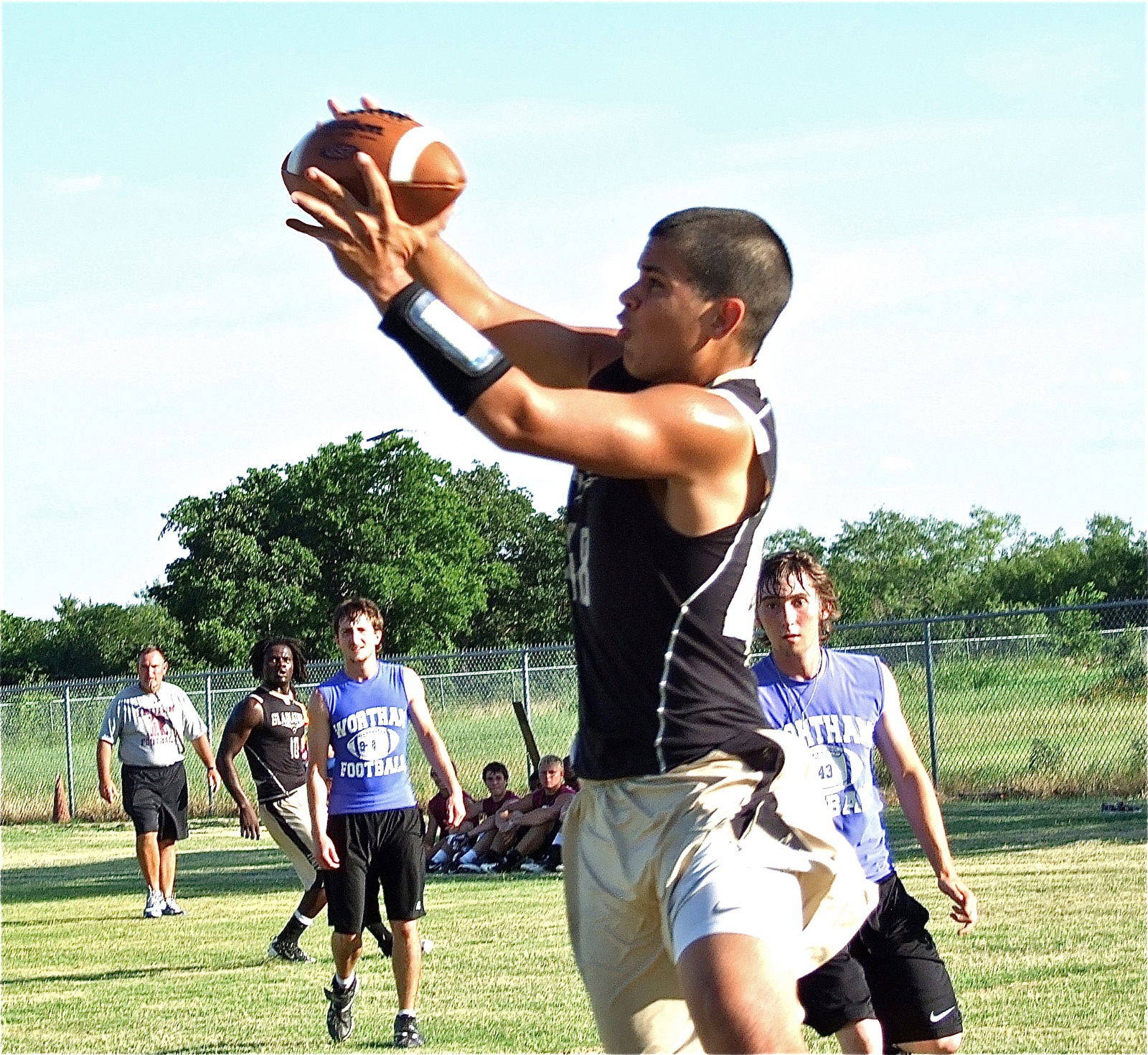 Italy’s 7-on-7 summer league football team wins three games in Axtell « previous story album next » Italy Gladiator Reid Jacinto leaps at the back of the end zone for a touchdown catch against Wortham. (Barry Byers) Download original photo