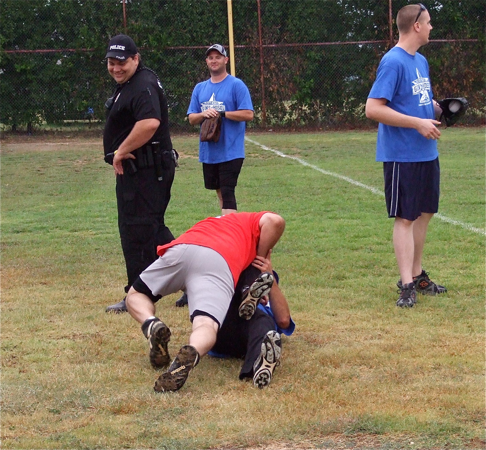 More Guns vs. Hoses pictures and fireworks footage « previous story album next » A pre-game disturbance breaks out when Italy Firefighter Jackie Cate jokingly attacks Italy Police Department team member Rodney Guthrie in a friendly brawl. (Barry Byers) Download original photo
