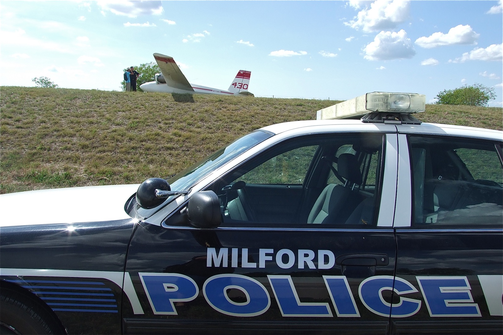 Glider makes a safe landing along Highway 35 between Italy and Milford « previous story album next » A view of the grounded glider from Chief Phoenix’s police cruiser. (Barry Byers) Download original photo