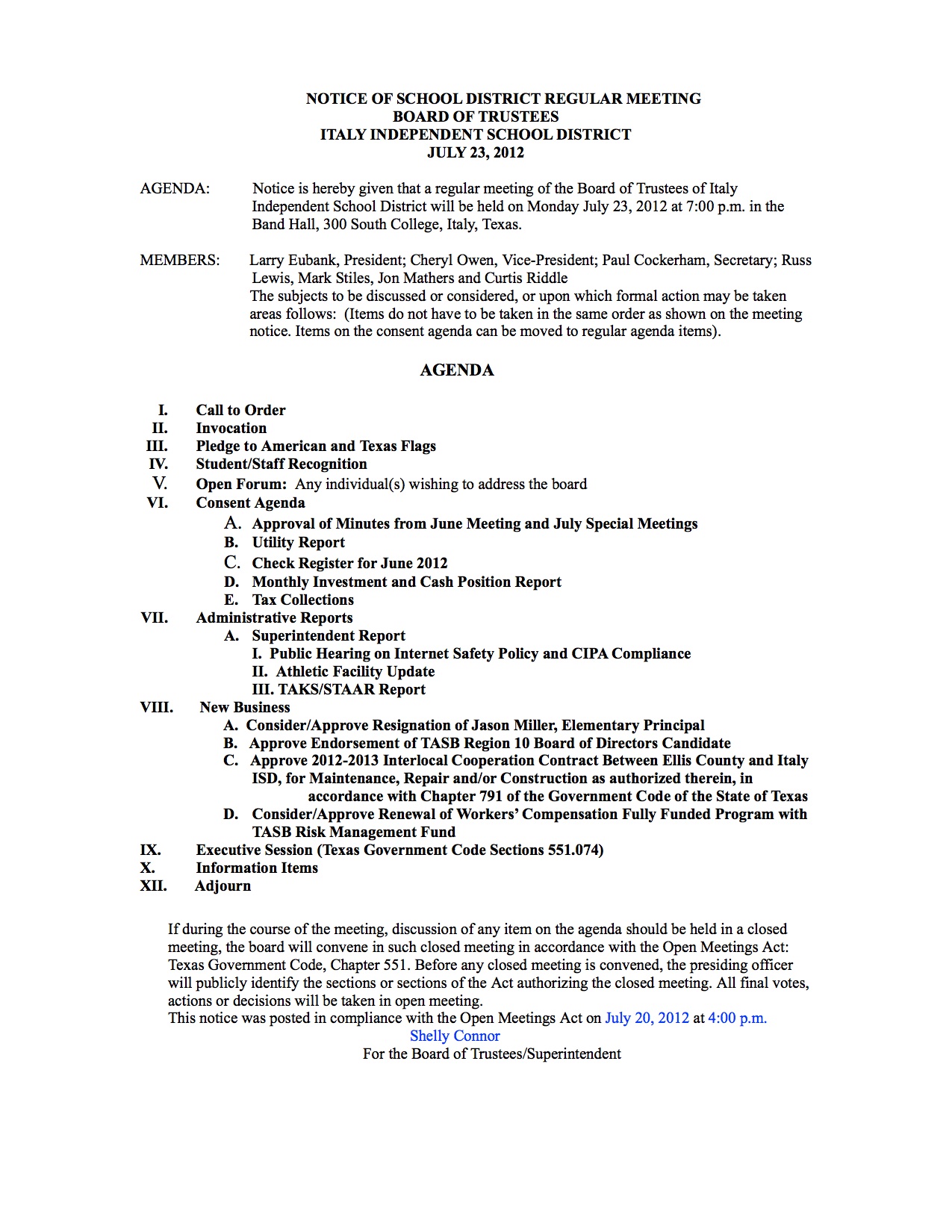 Agenda: Italy ISD School Board Meeting — Monday, July 23, 2012 « previous story album next » Download original photo