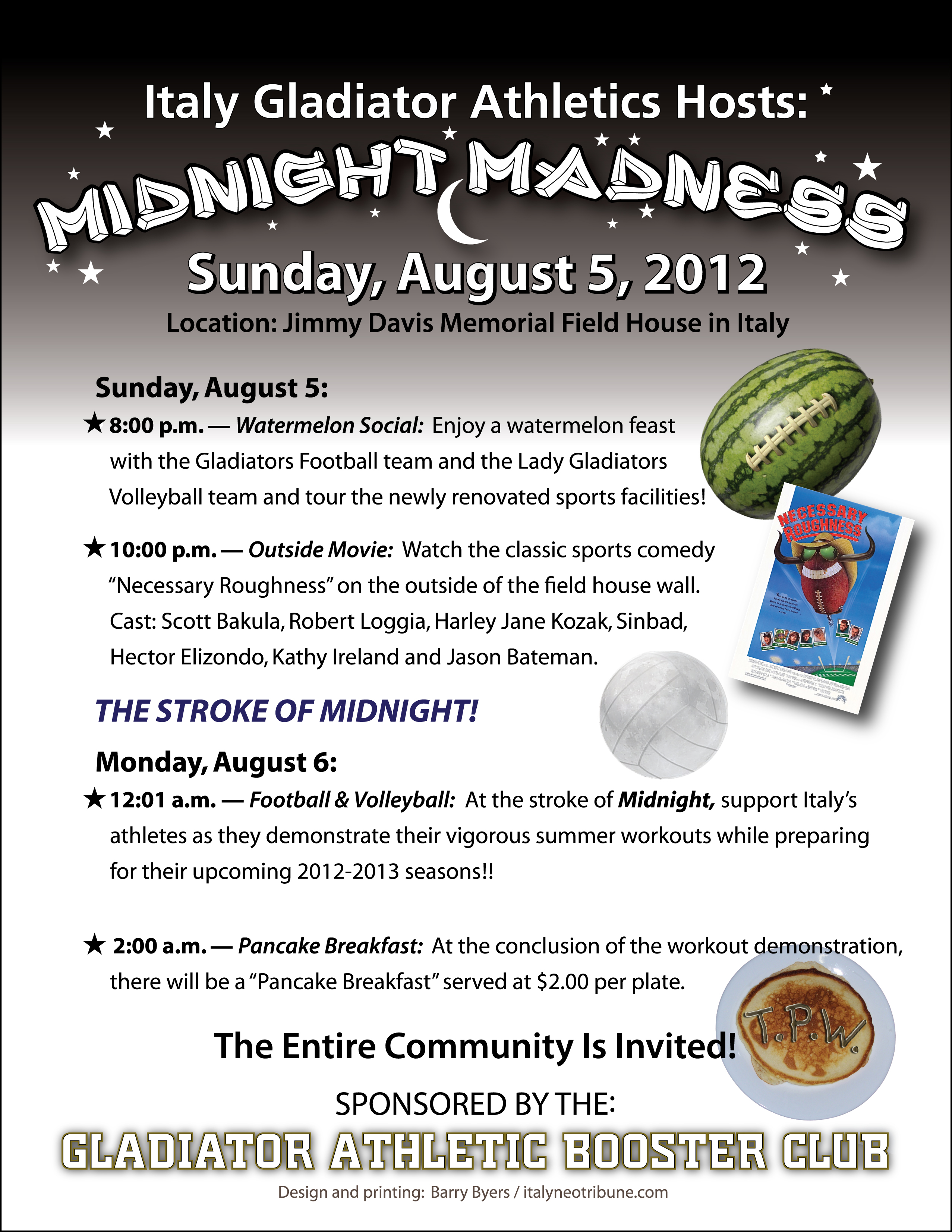 Midnight Madness! Your invited to celebrate with Italy Gladiator Athletics « previous story album next » Midnight Madness with Italy Gladiator Athletics kicks-off on Sunday, August 5 at 8:00 p.m. and concludes Monday, August 6 around 3:00 a.m. (Barry Byers) Download original photo