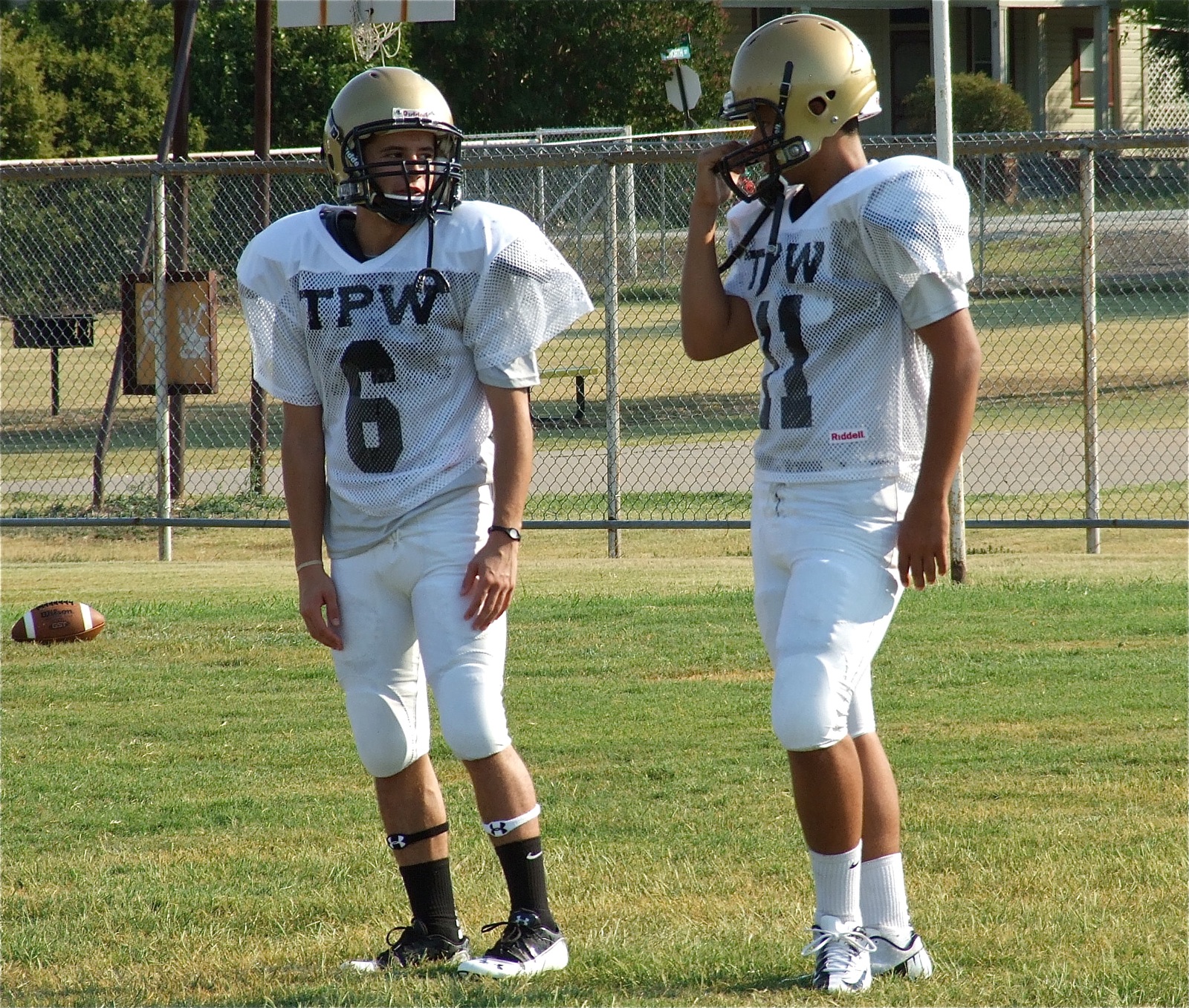 Gladiators armor up and lay the ground work for the upcoming season « previous story album next » Cousins Caden Jacinto(6) and Reid Jacinto(11) discuss their pass routes between snaps. Both players made sure-handed catches during team drills on Friday. (Barry Byers) Download original photo
