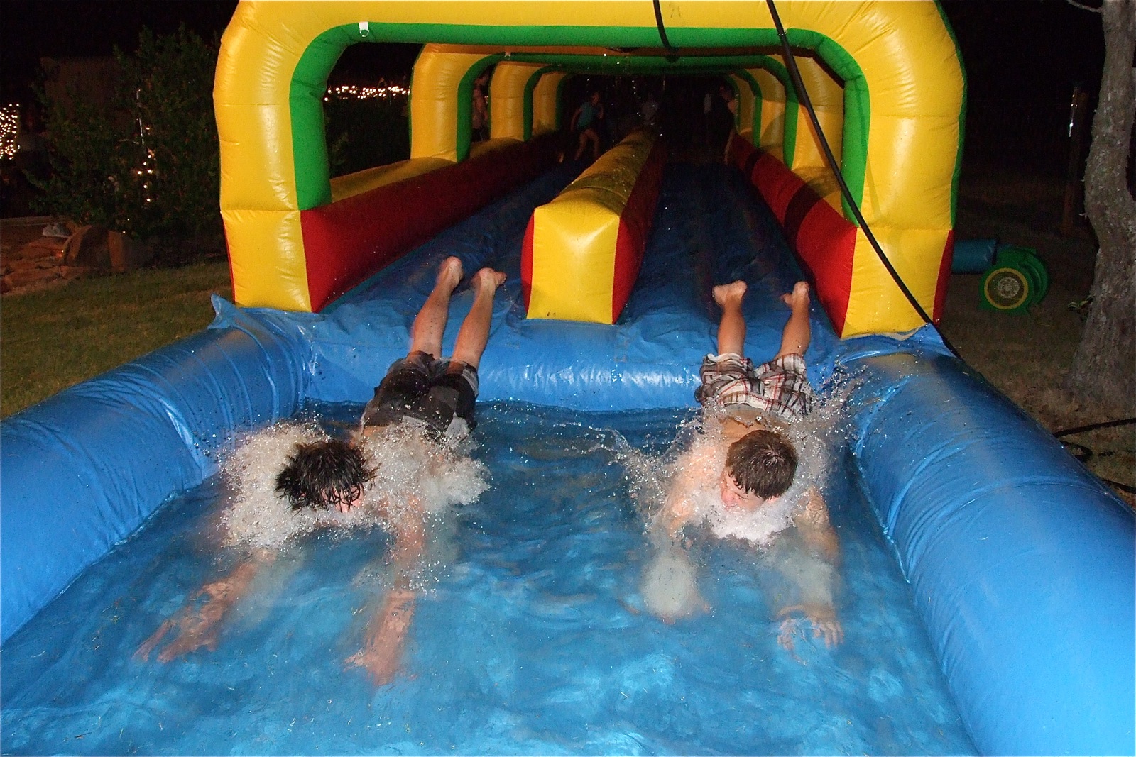 Italy High School students enjoy Back-to-School Bash hosted by the Lewis Family « previous story album next » Kyle Fortenberry on the left edges John Escamilla at the finish on the slip-n-slide. (Barry Byers) Download original photo