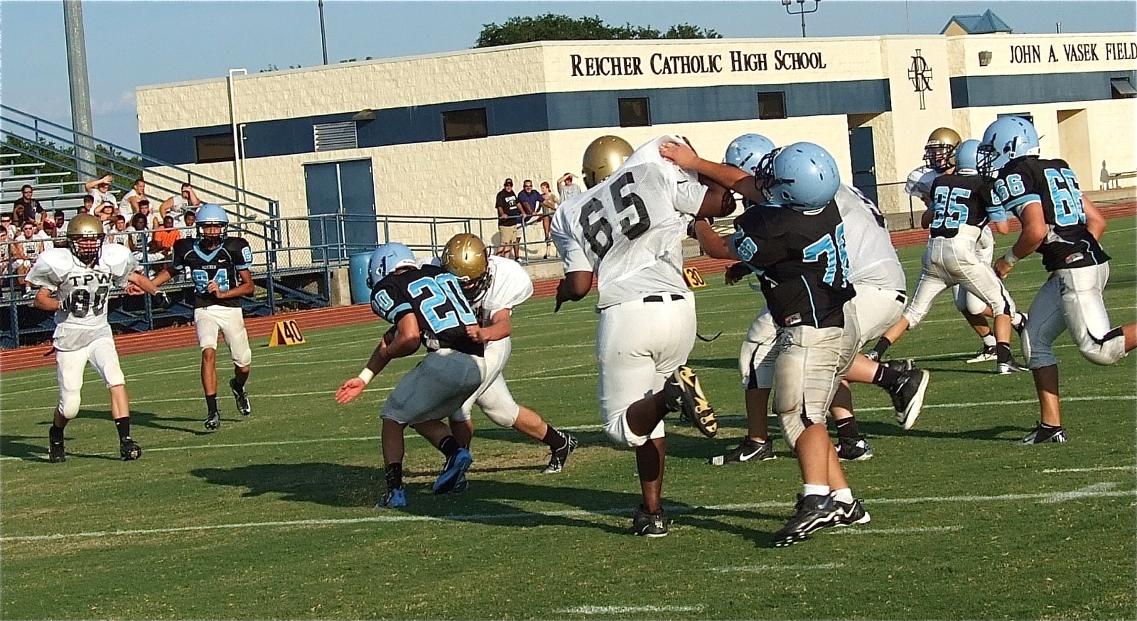 Italy’s JV Gladiators impress fans during hard-hitting scrimmage against Cougars « previous story album next » Linebacker Kyle Fortenberry(66) fills the hole with authority to stop a Cougar in his tracks! (Barry Byers) Download original photo