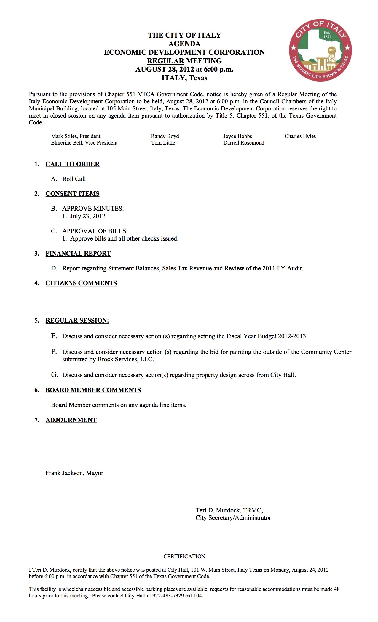 Agenda: Italy Economic Development Corporation, Tuesday, August 28, 2012 « previous story album next » Agenda Download original photo