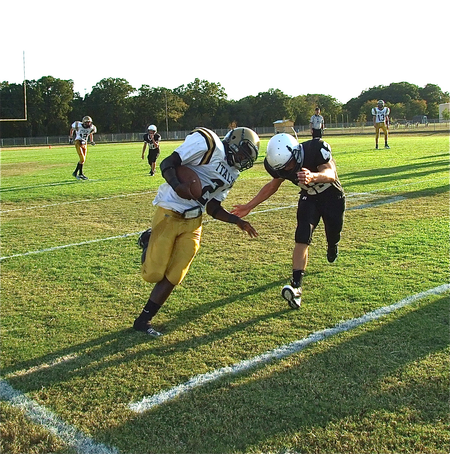 Italy’s JV Gladiators win a few battles but Malakoff wins the war 38-20 « previous story album next » Helmet-to-helmet: Marvin Cox(2) gets knocked out-of-bounds after a long gain. (Barry Byers) Download original photo