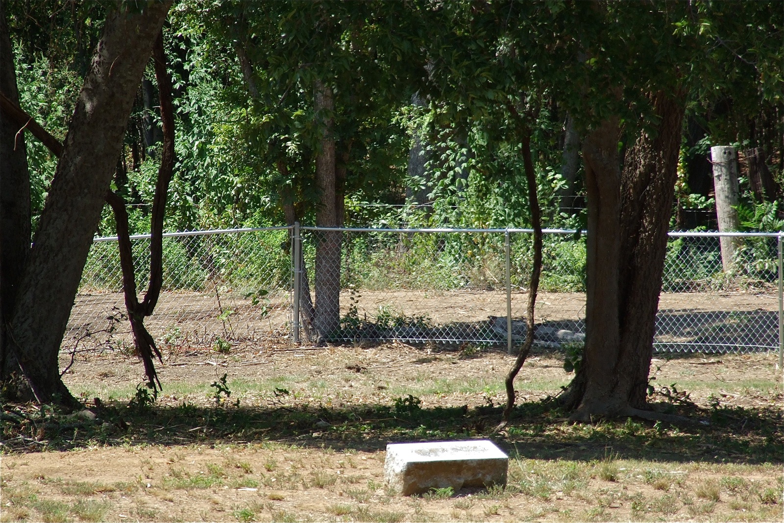 A better view of an area of the cemetery where the foliage had been removed by bulldozers and where the new chain-link fence is constructed inside the cemetery. Beyond the fence is the road carved out by Creek Land & Cattle Company. (Barry Byers)