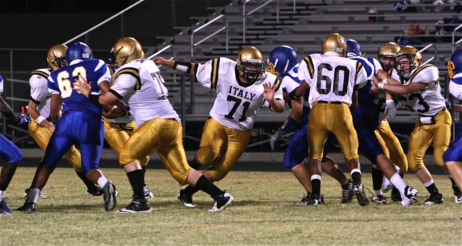 The JV Gladiators and Sunnyvale battle to final seconds after Junior High games « previous story album next » John Byers(75) kicks out, John Hughes(60) seals down and Colin Newman(71) pulls through to lead Billy Moore(32) down the field. (Barry Byers) Download original photo
