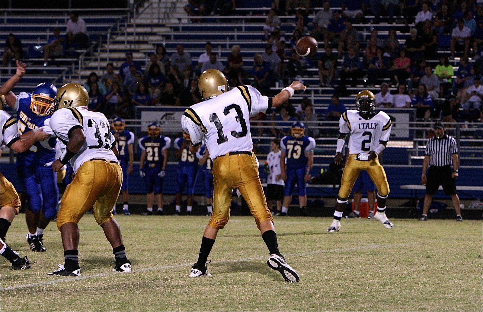 The JV Gladiators and Sunnyvale battle to final seconds after Junior High games « previous story album next » Ryan Connor(13) quick passes to Marvin Cox(2) with Billy Moore(32) protecting. (Barry Byers) Download original photo