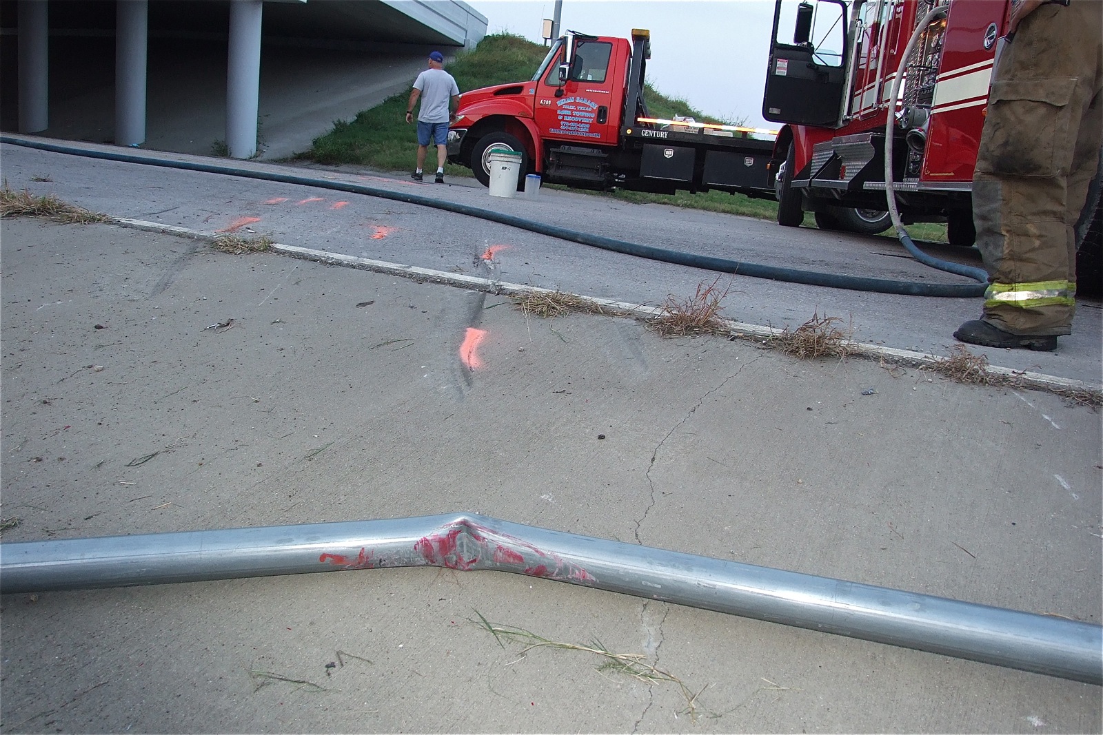 Car chase ends in collision with 18-wheeler in Italy « previous story album next » Sign pole damage and scrape marks leading to the point of impact. (Barry Byers) Download original photo