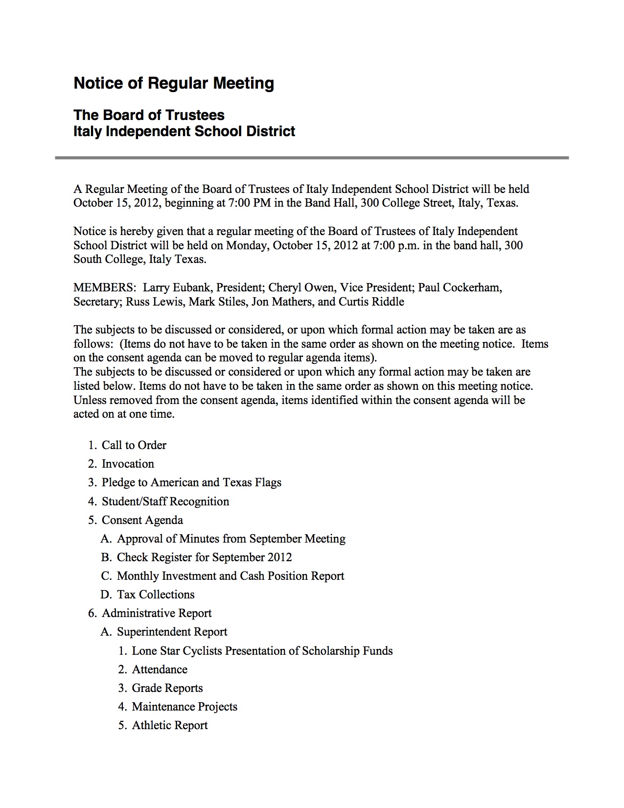 Agenda: Italy ISD School Board Meeting — Monday, October 15, 2012 « previous story album next » Agenda – page 1 Download original photo