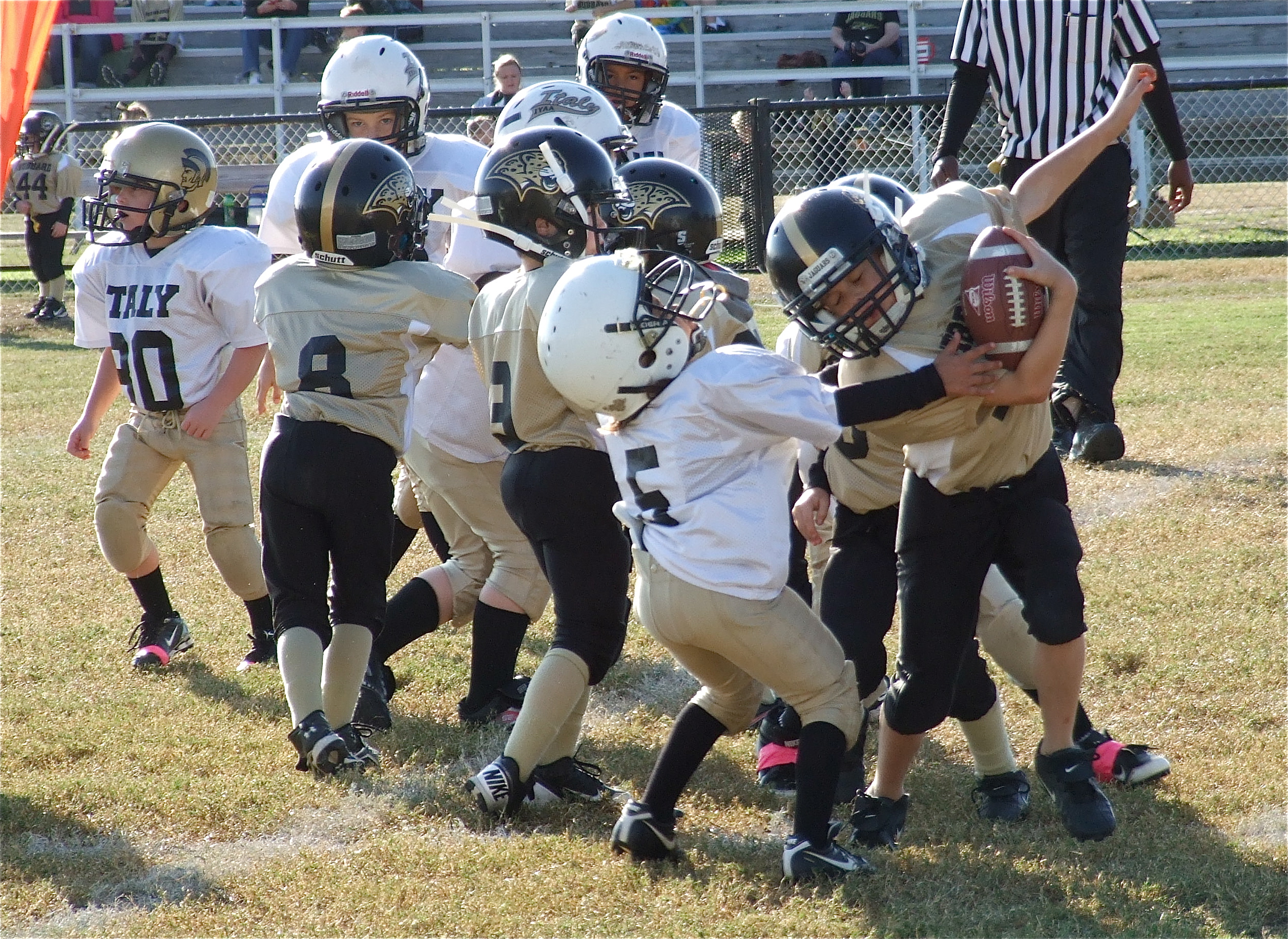 IYAA Homecoming 2012 included parade floats, a town pep rally and three wins « previous story album next » C-Team Gladiator Damien Wooldridge(5) tries to bring down a Hubbard Jaguar. (Barry Byers) Download original photo