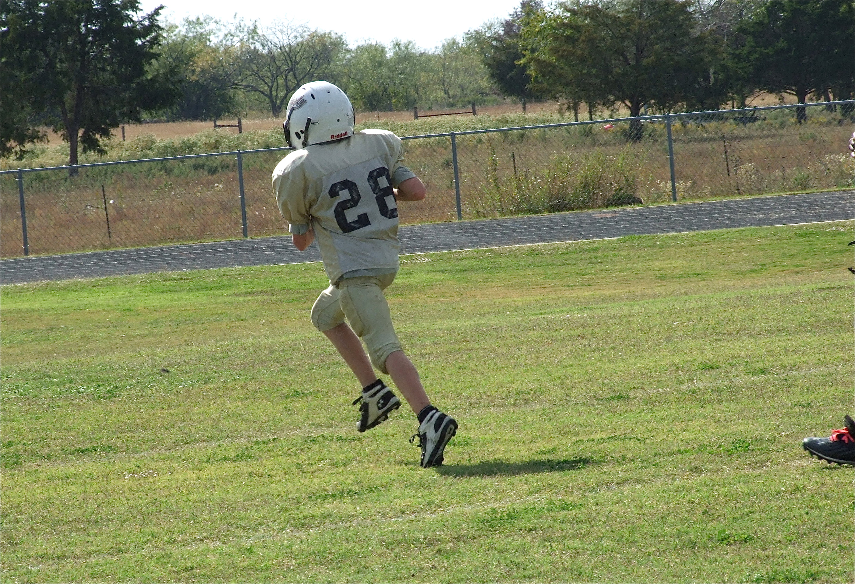 Italy goes up 20-0 against Hubbard when Garrett Cash(28) catches a pass from teammate Ryder Itson(28) and then rushes into the end zone for an A-team Gladiator touchdown. (Barry Byers)