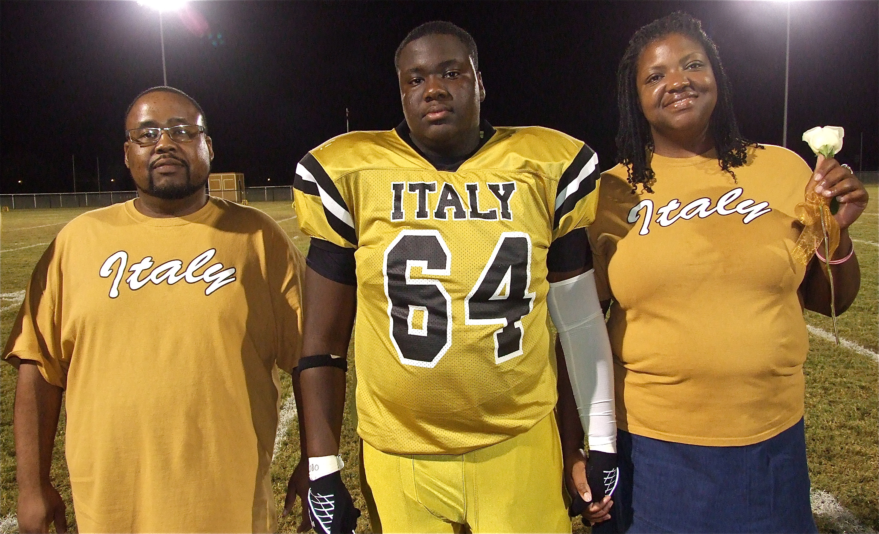 Senior Gladiator Adrian Reed(64) is escorted by his parents Brendetta and Jimmy Reed. Adrian plans to attend Houston Baptist University and become an engineer. His most memorable moment in athletics was hanging out with friends before each game. (Barry Byers)