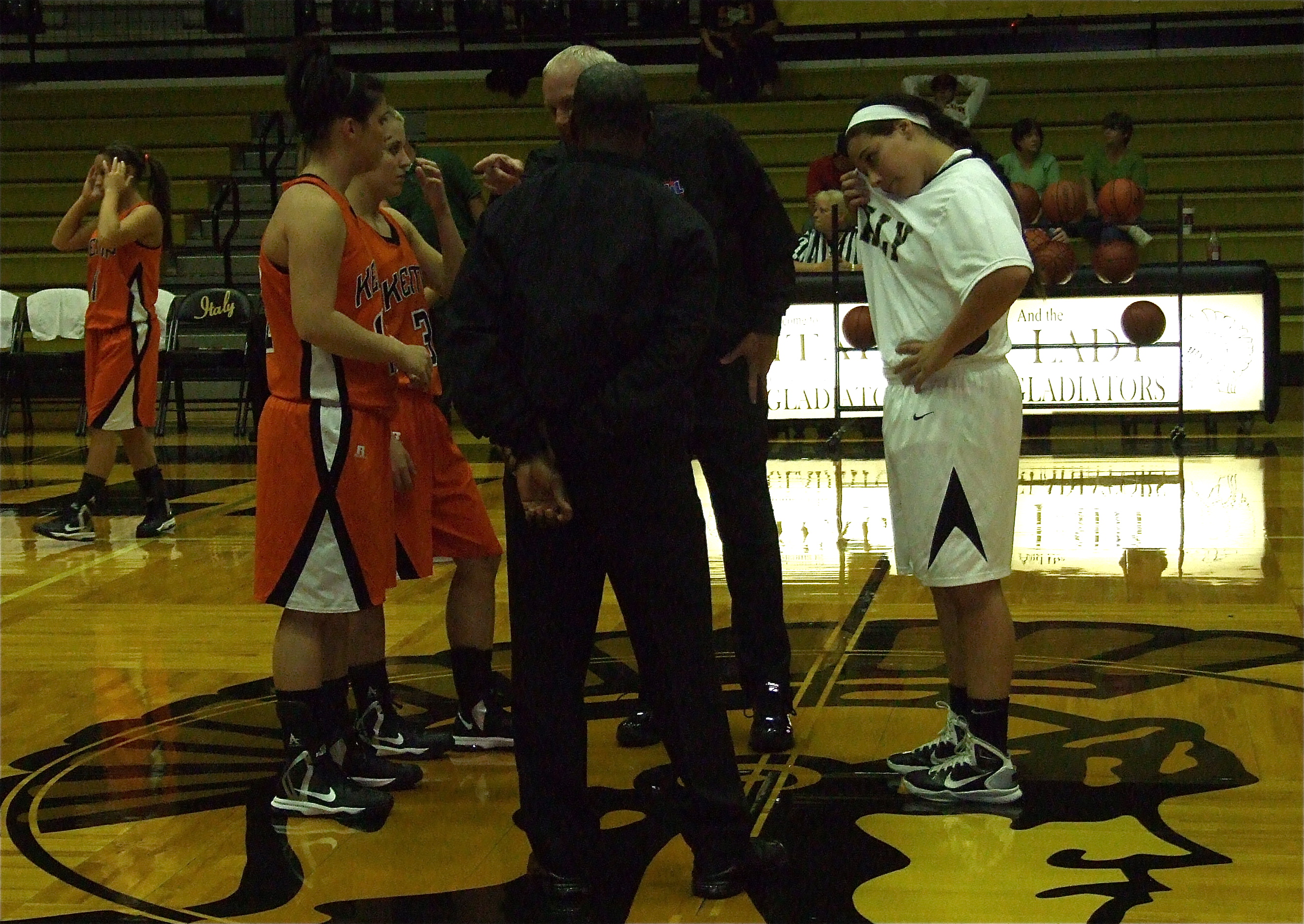 Lady Gladiators play first home game of 2012-13 season « previous story album next » Alyssa Richards meets Kemp at center court before the start of the game. (Barry Byers) Download original photo
