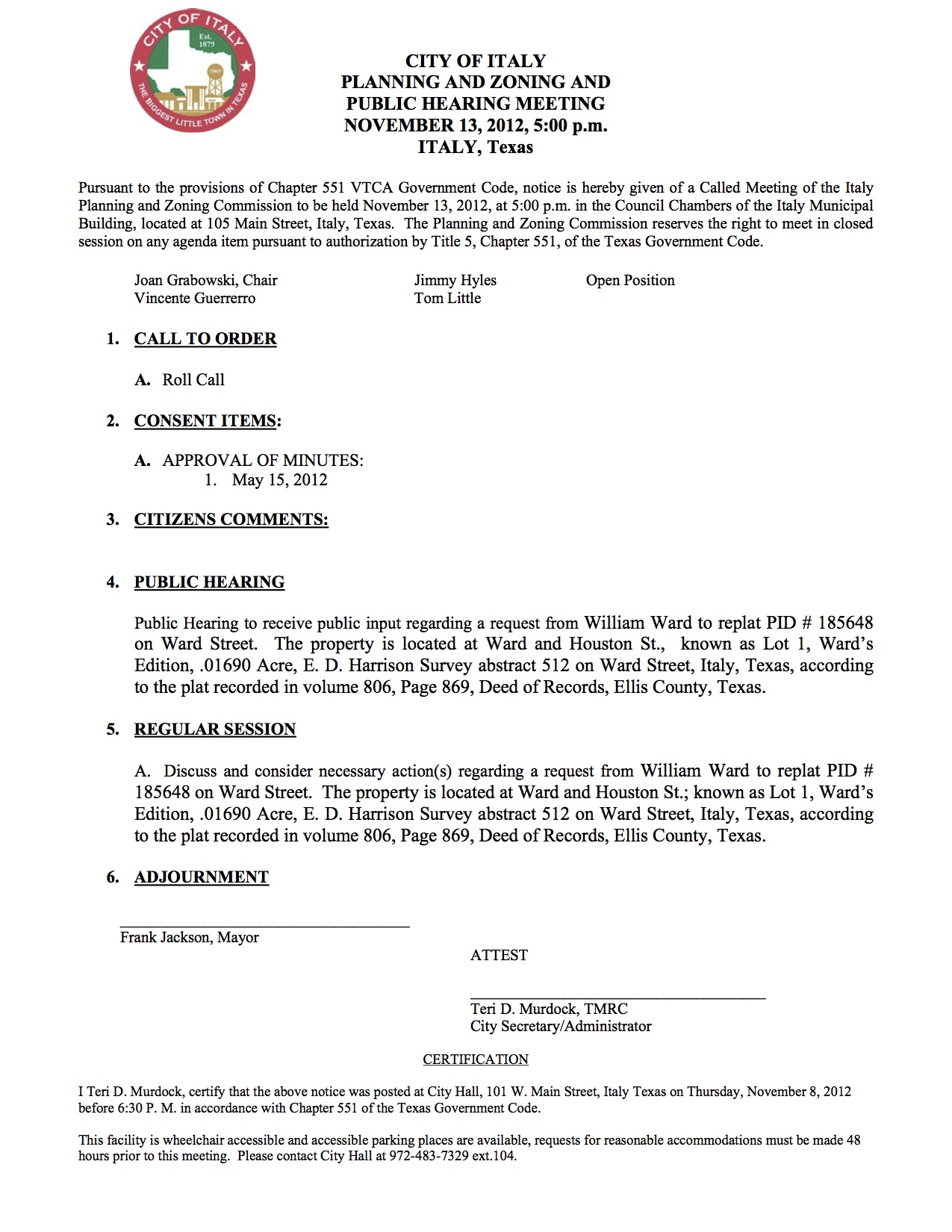 Agenda: Italy Planning and Zoning Commission public hearing, November 13, 2012 « previous story album next » Agenda (http://www.ci.italy.tx.us) Download original photo