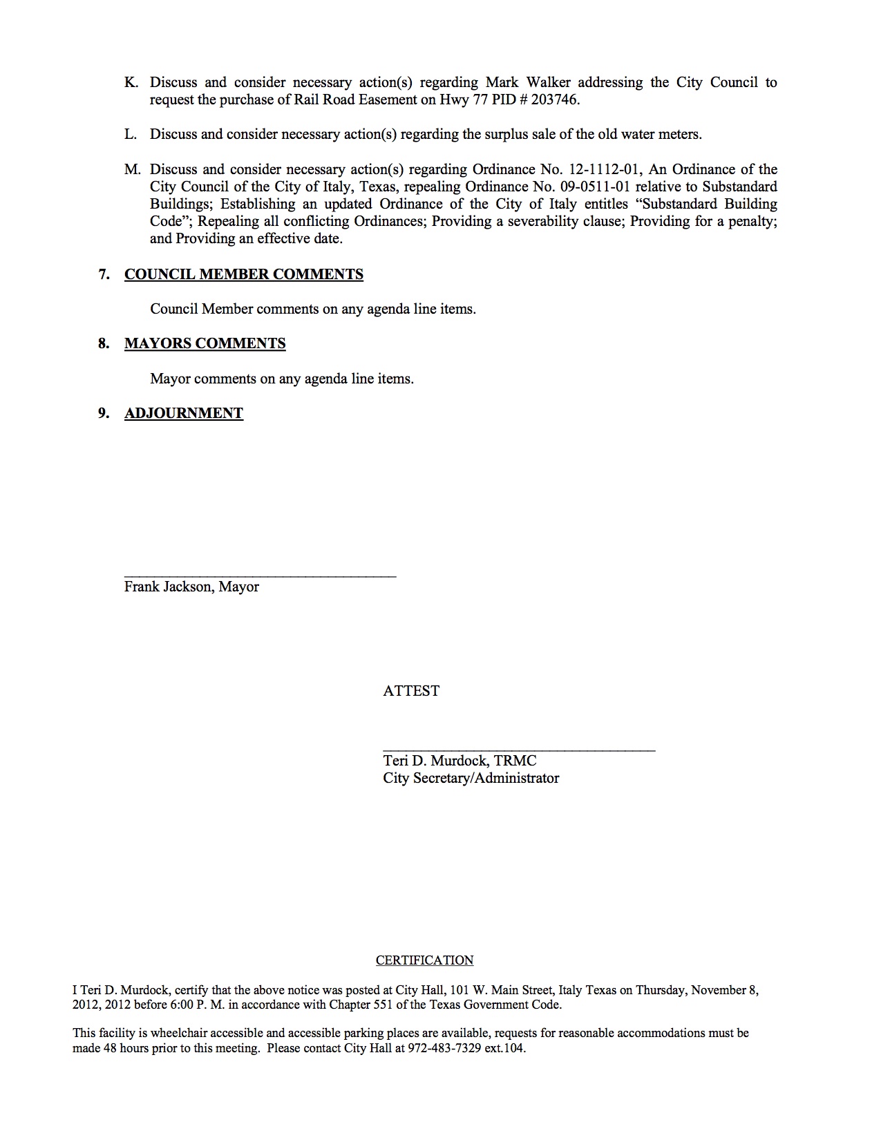 Agenda: Italy City Council Meeting – Monday, November 12, 2012 « previous story album next » Agenda – page 2 (http://www.ci.italy.tx.us) Download original photo