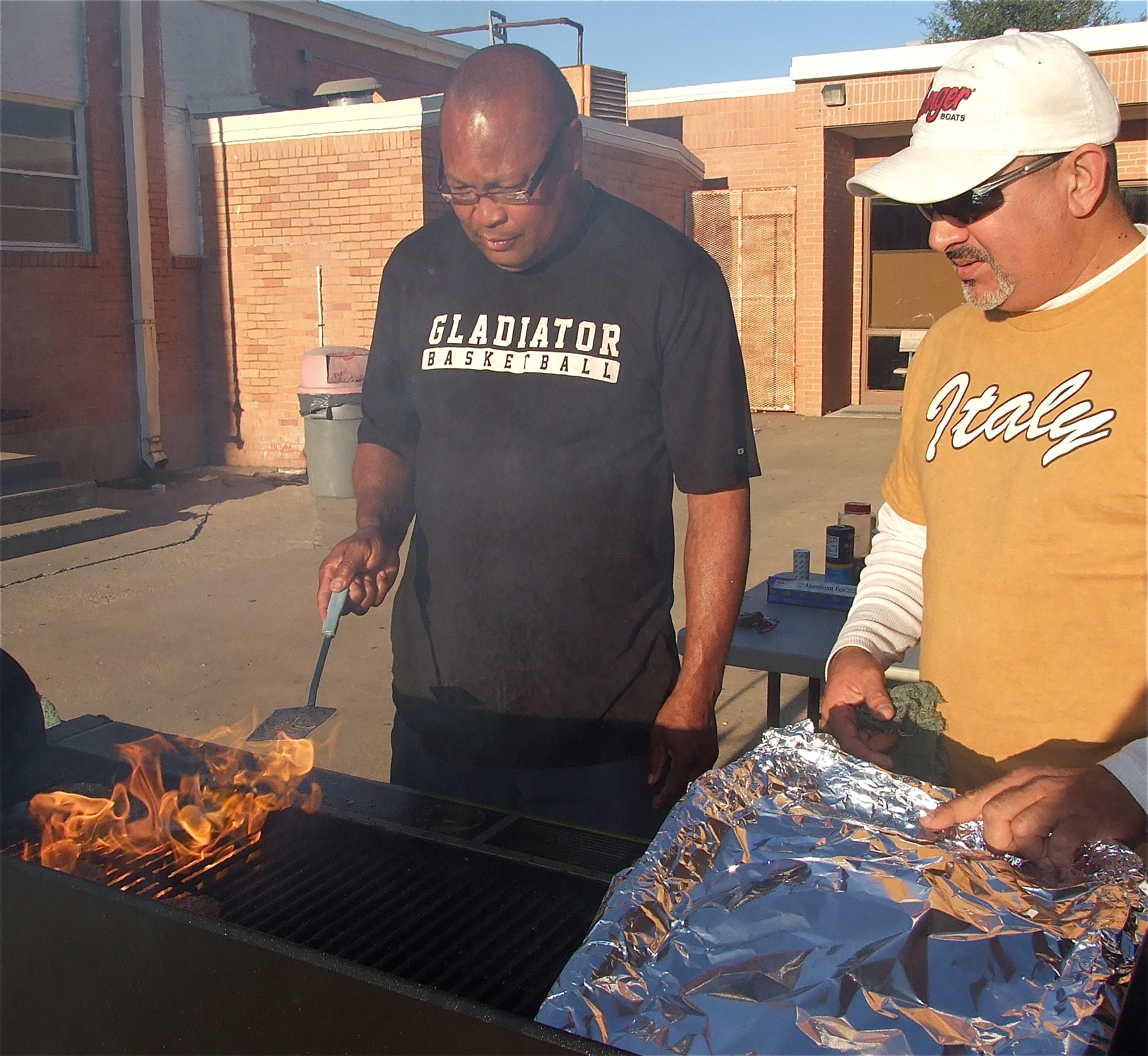Gladiator assistant coach Larry Mayberry, Sr. and team dad Mark Jacinto prepare victory hamburgers for the 2012 district champion Italy Gladiators who also earned a first-round bye and the bi-distrcit championship as well after going 5-0 in district play. (Barry Byers)