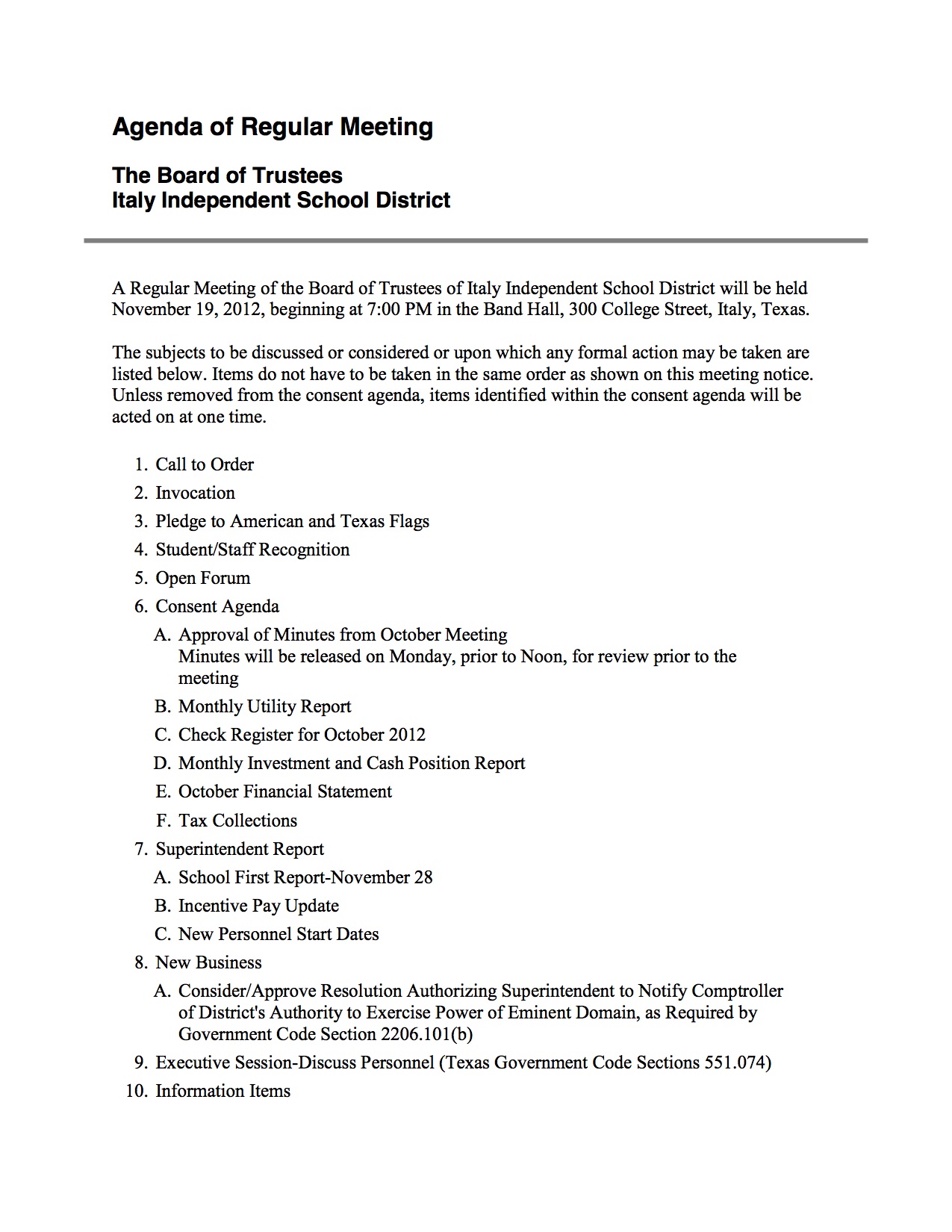 Agenda: Italy ISD School Board Meeting — Monday, November 19, 2012 « previous story album next » Agenda – page 1 (Italy ISD website) Download original photo