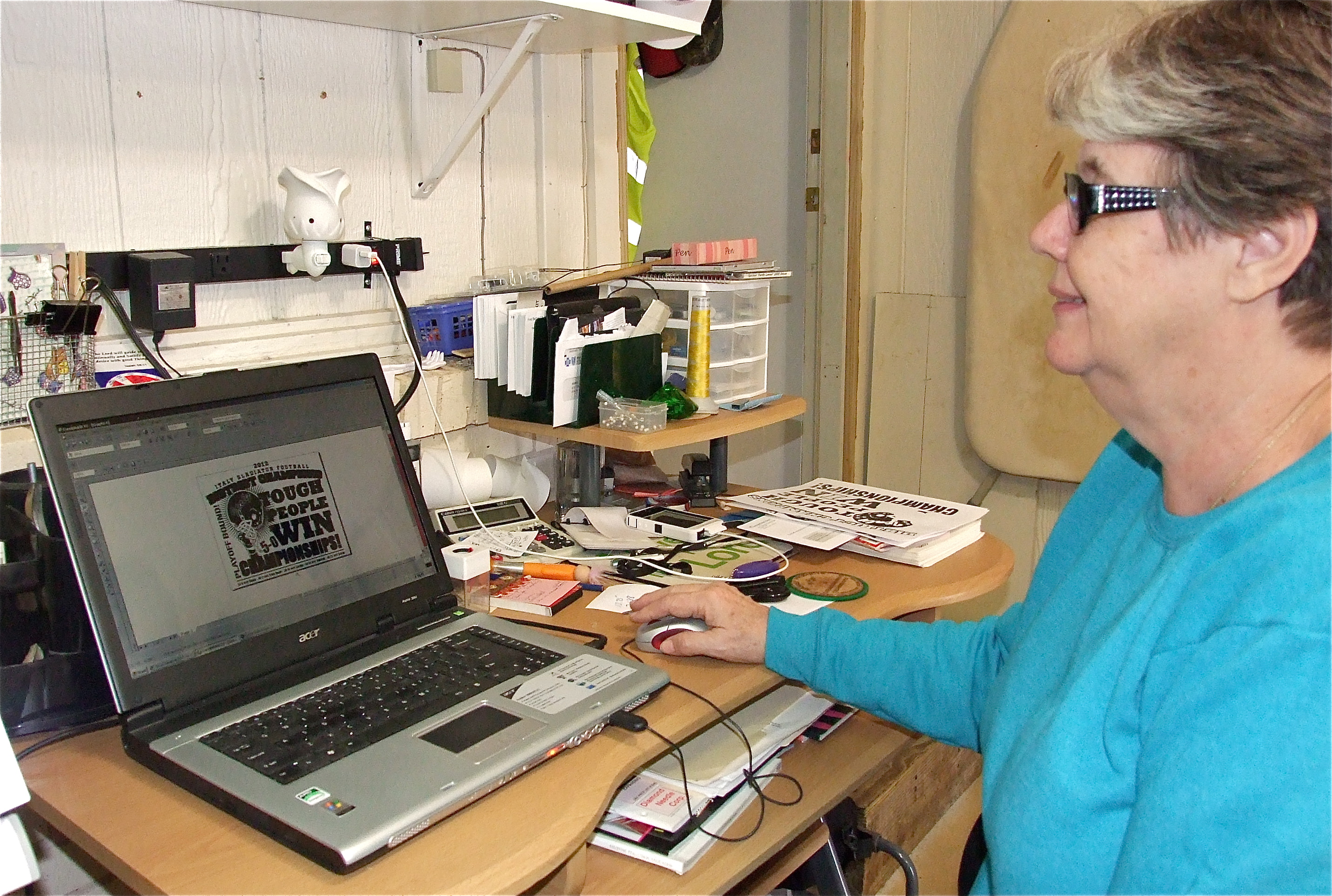 Sandy Dabney with Lil’ Dab Embroidery of Italy, while doing the preliminary work before printing Italy Gladiator Football’s district champion/playoff bound shirts which are now ready for fans to wear to Friday’s game! Italy will challenge Valley View for the area championship being played at Pennington Field, in Bedford. (Barry Byers)