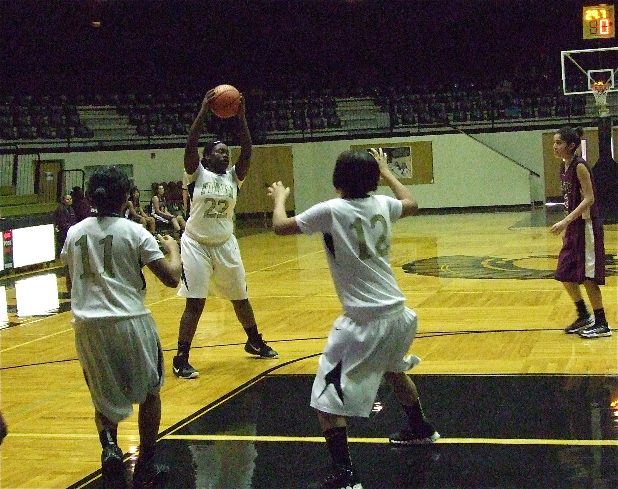 Lady Gladiators advance to second round of Italy Invitational Basketball Tourney « previous story album next » Italy’s Taleyia Wilson(22) is looking for open teammates as Ryisha Copeland(11) and Alex Minton(12) flash into the lane. (Barry Byers) Download original photo