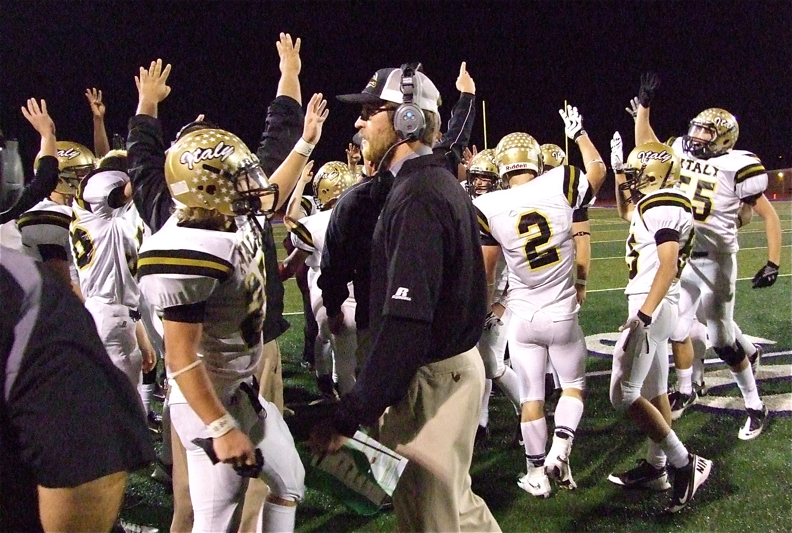 Italy continues playoff run by upsetting Honey Grove 33-20 in regional semifinal « previous story album next » Lean On Me Four! Italy’s coaching staff and players fire up for the fourth-quarter. (Barry Byers) Download original photo