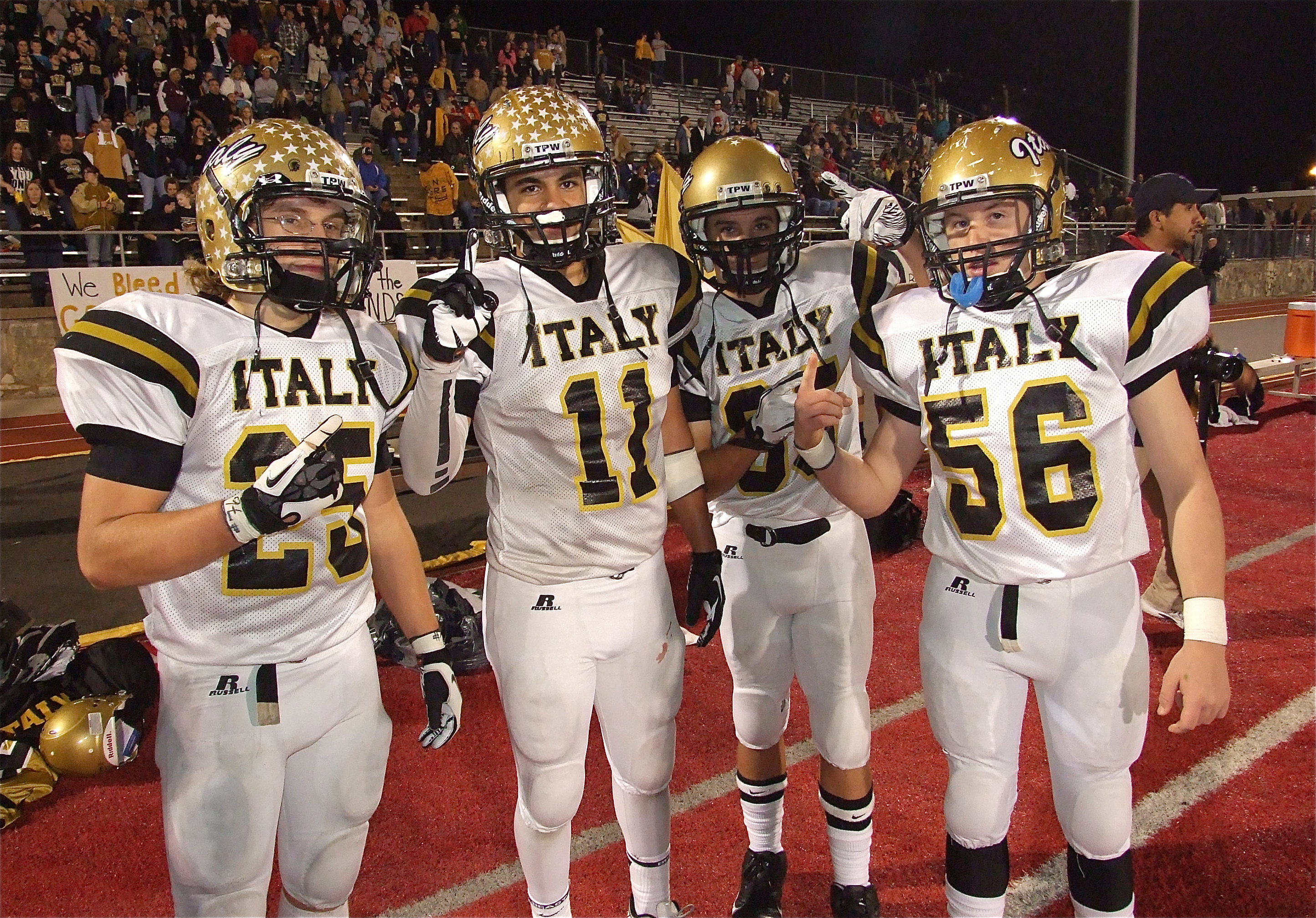 Italy upsets Goldthwaite 14-3 for regional quarterfinal championship! « previous story album next » Shad Newman(25), Reid Jacinto(11), Levi McBride(85) and John Escamilla(56) join in with the fans who can feel a victory! (Barry Byers) Download original photo