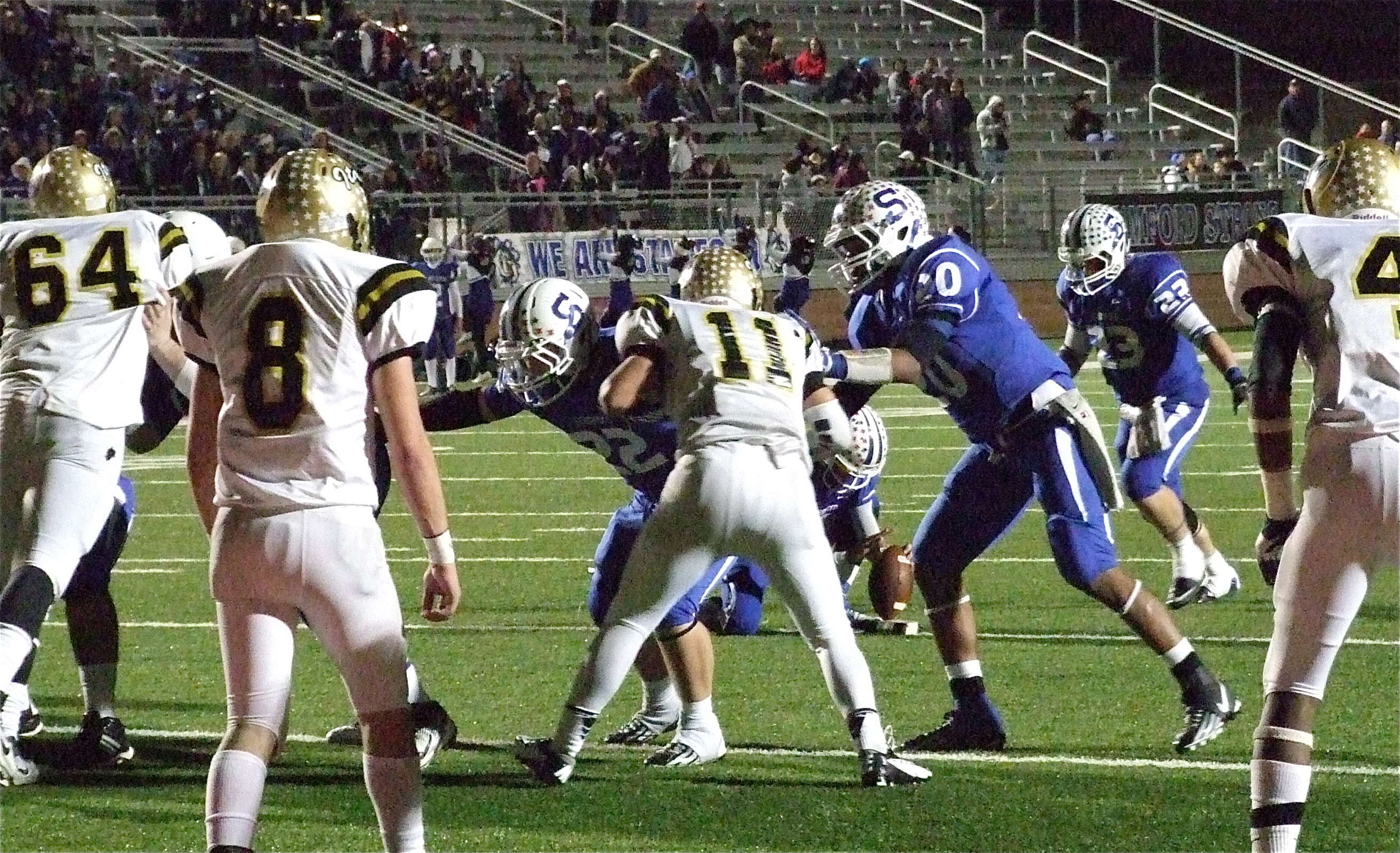 Italy vs. Stamford for the Class A state semifinal championship; continued: « previous story album next » Adrian Reed(64), Hayden Woods(8), Reid Jacinto(11) and Trevon Robertson(4) make sure Stamford only kicks a field goal instead of trying a fake. (Barry Byers) Download original photo