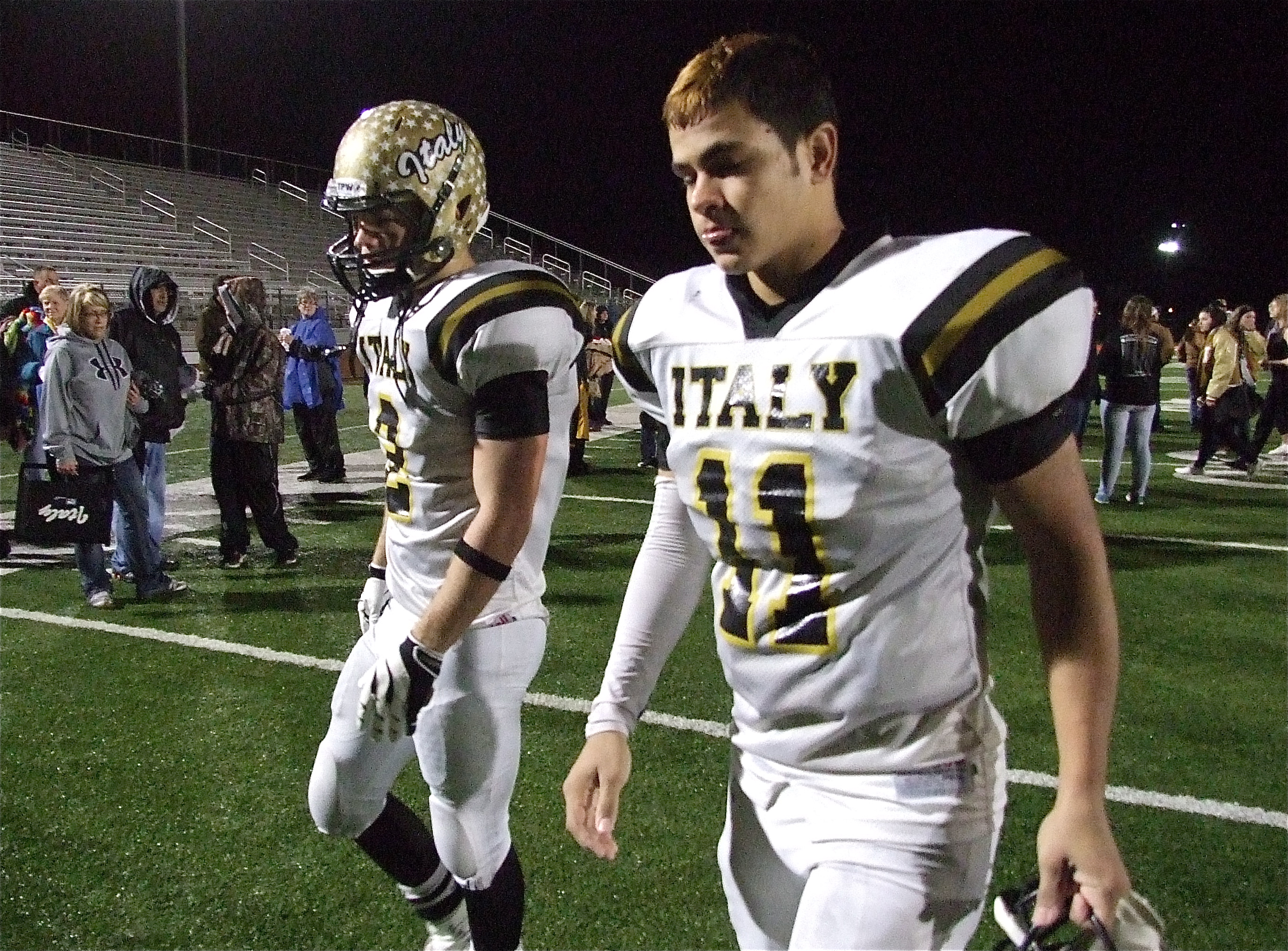 Senior Gladiators Chase Hamilton(2) and Reid Jacinto(11) take those difficult last steps back to the locker room with Italy’s amazing run ending in Mineral Wells with the Stamford Bulldogs getting the 41-8 win to advance to the state championship against the Mart Panthers. (Barry Byers)