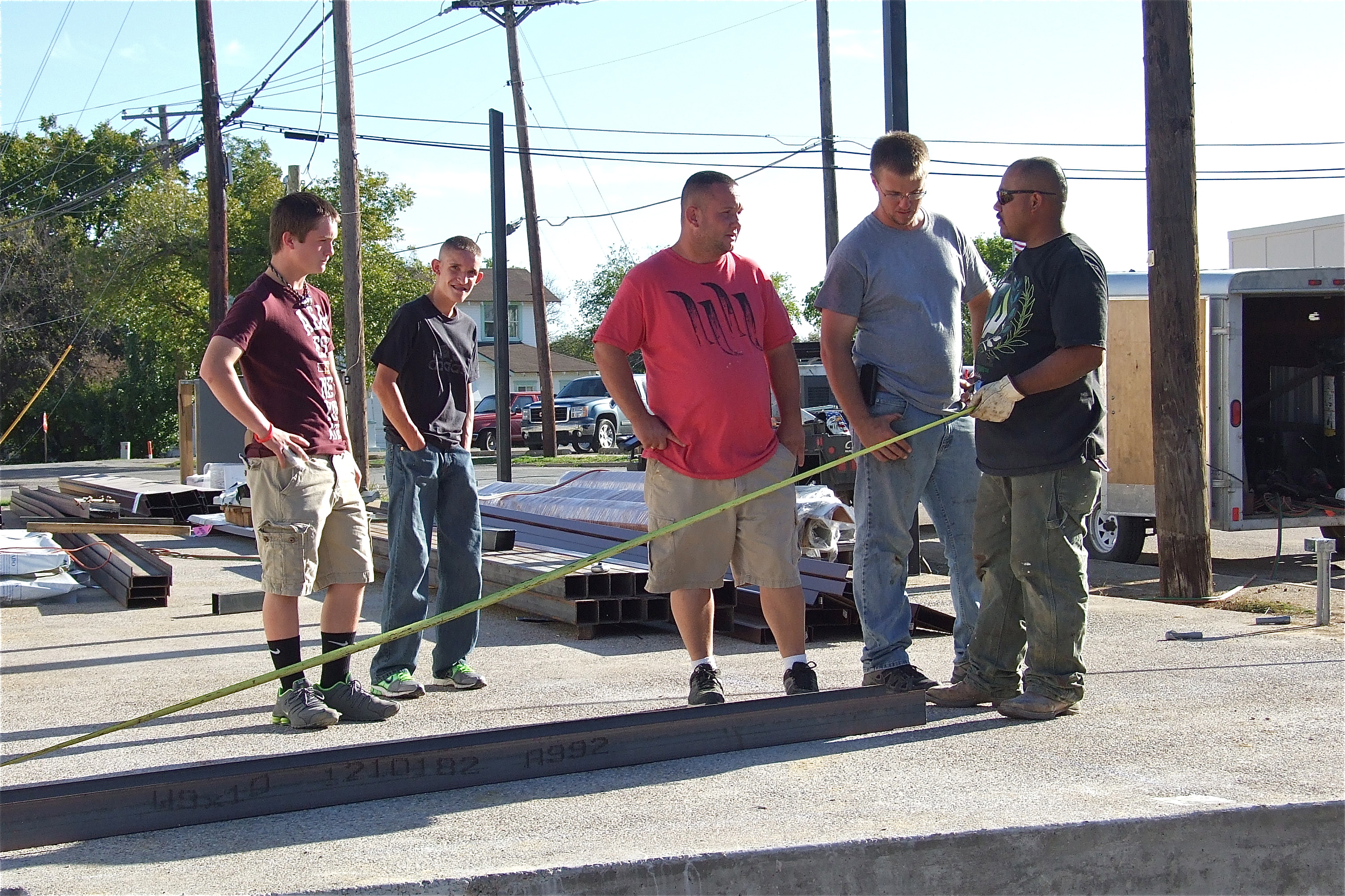 Devon Bowles and Nathan Brock look on as their dad, Michael Bowles, owner of Bowles Redi Mix, Inc. of Italy, discusses the structure’s measurements with the work crew. (Barry Byers)