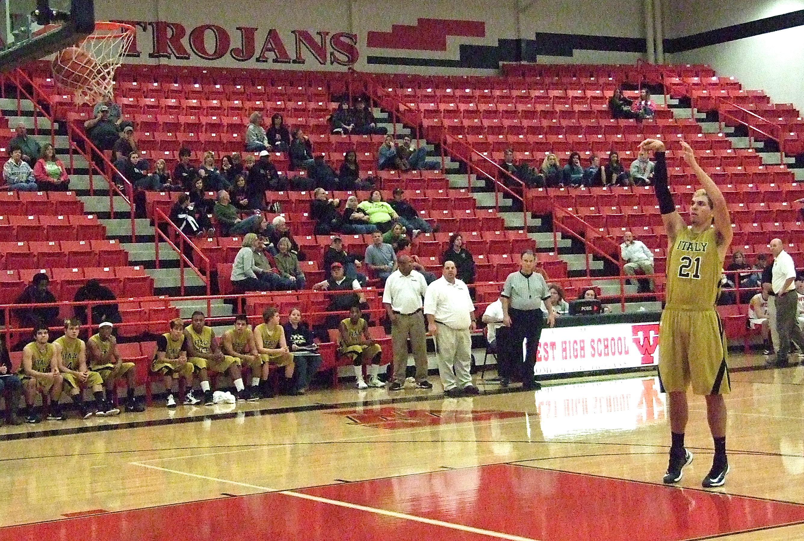 Gladiators finding a rhythm on the hardwood but victory eludes them in West « previous story album next » Italy’s Cole Hopkins(21) drops in a technical foul shot to begin the second half after West was slapped with a halftime violation. (Barry Byers) Download original photo