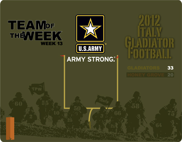 The Italy Gladiators were awarded the Army Strong Team of the Week in week 13 by the United States Army after getting the job done against Honey Grove by a score of 33-20 to claim the regional final championship. (Barry Byers)