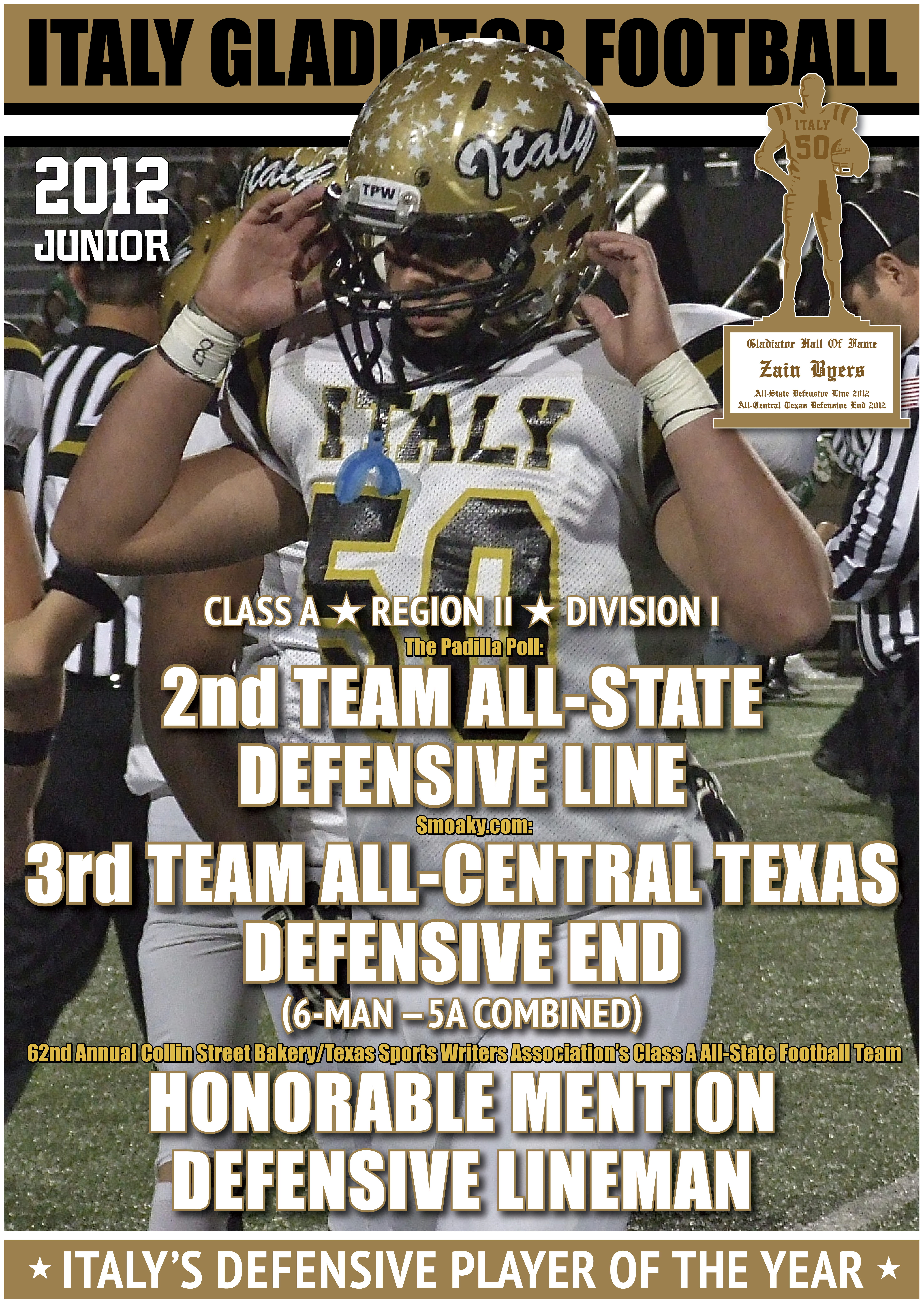 Walker, Cox and Byers earn all-state honors; Hollywood named Coach Of The Year « previous story album next » Congratulations to Italy’s junior C/OL/DE Zain “Zilla” Byers(50) on all his 2012 post-season honors as a Gladiator. Download original photo
