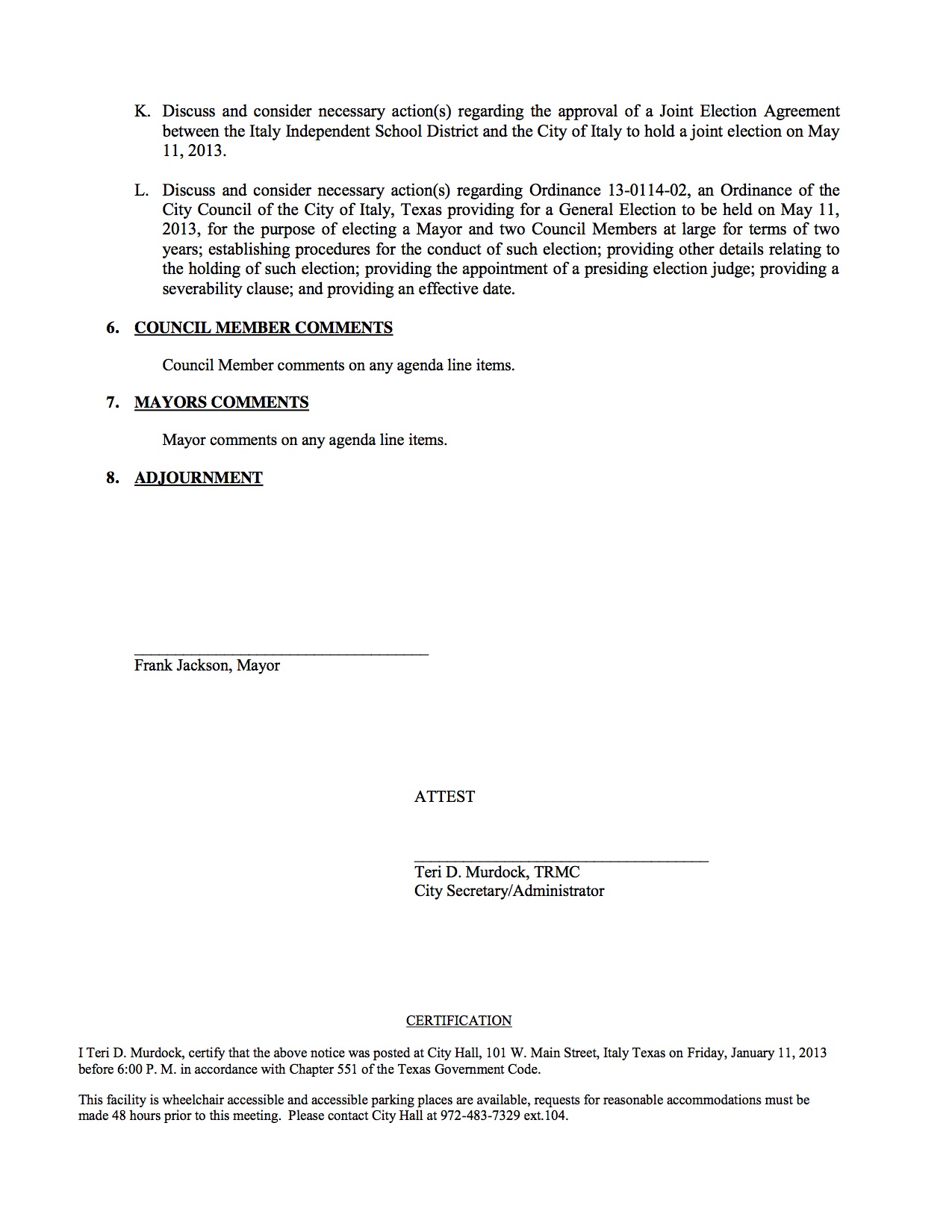 Agenda: Italy City Council Meeting, Monday, January 14, 2013 « previous story album next » Download original photo