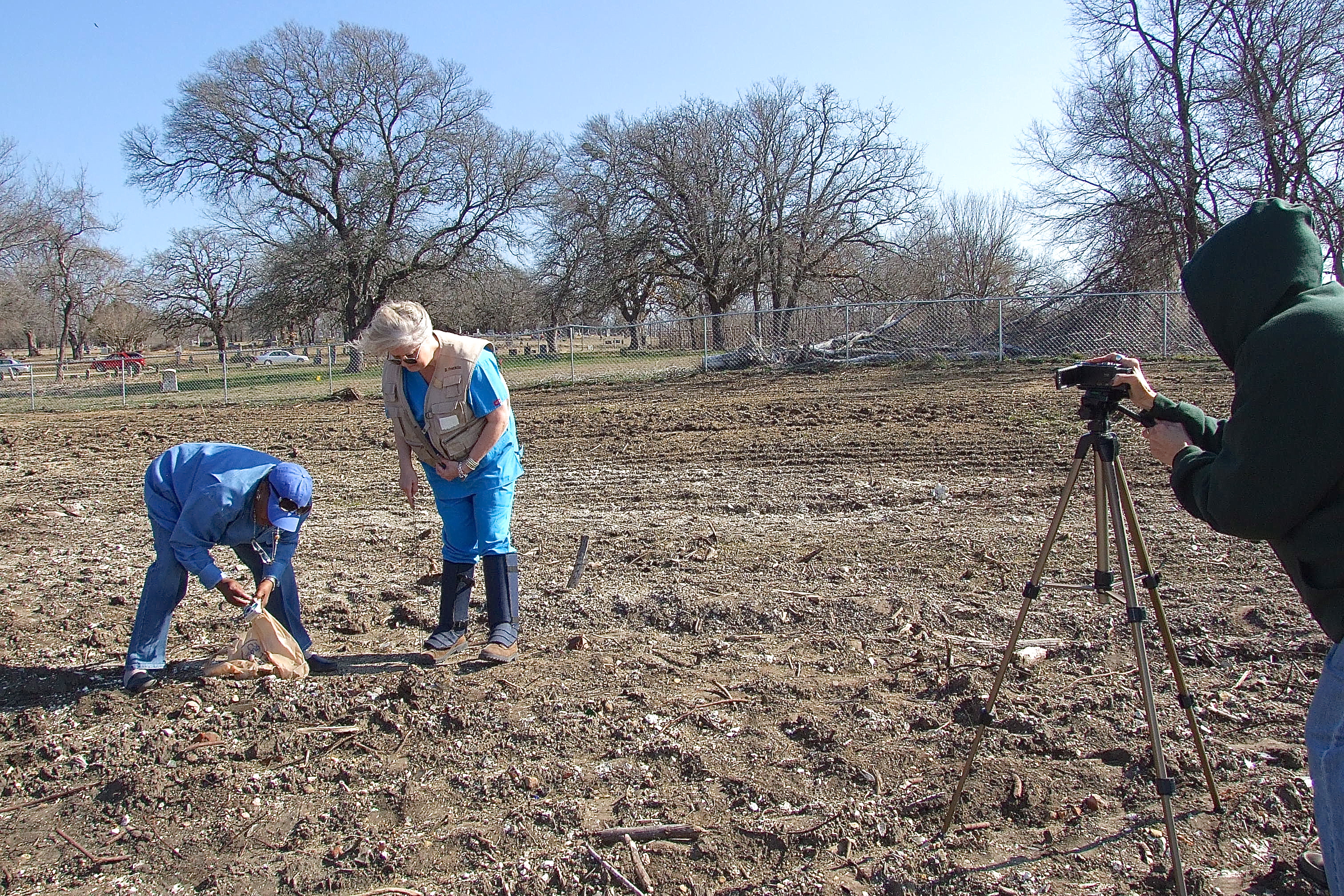 Videographer Susan Turner records Bell and Dr. Graveyard as they explain the devastation that has occurred at the cemetery by the bulldozers of the Creek Land and Cattle Company. (Barry Byers)