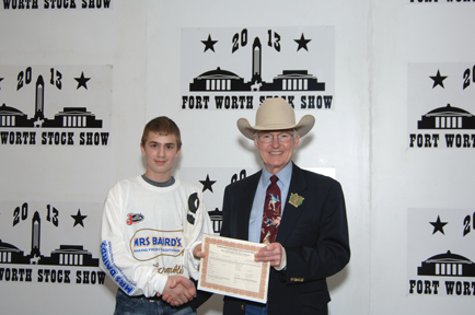 Brandon Connor won a $500 purchase certificate toward a registered beef or dairy heifer for a 4-H or FFA project to exhibit at next year’s Fort Worth Stock Show and Rodeo. The certificate, presented by Ed Bass, FWSSR Chairman of the Board, was sponsored by Frank Kent Cadillac of Fort Worth. (Fort Worth Stock Show and Rodeo)