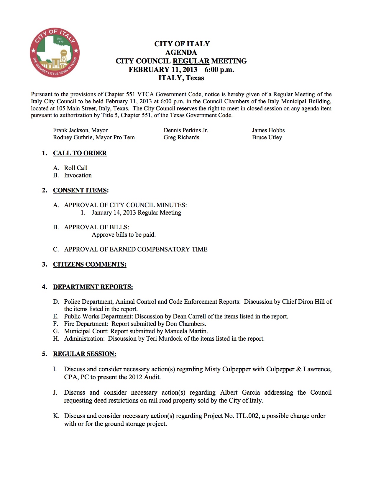 Agenda: Italy City Council Meeting, Monday, February 11, 2013 « previous story album next » Download original photo