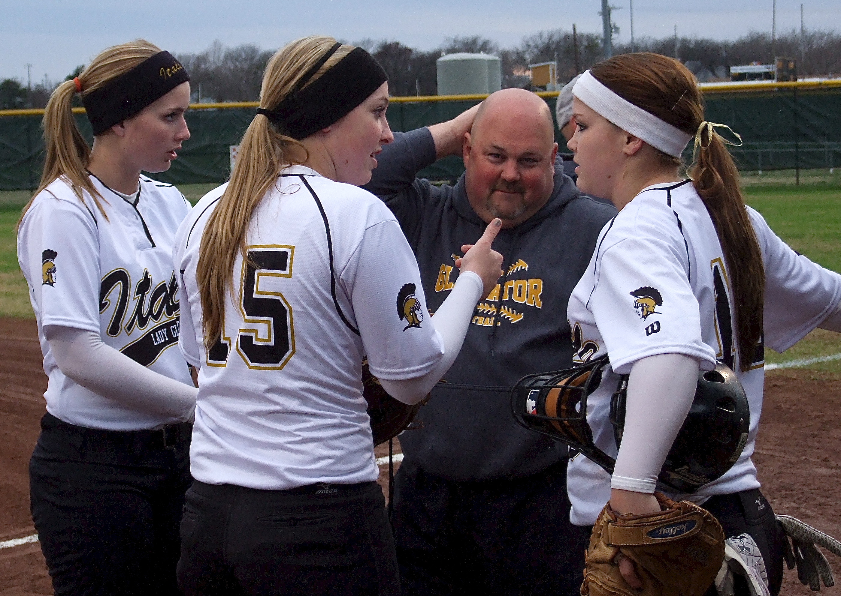 Additional coverage of the Lady Gladiators’ first softball outing of 2013 « previous story album next » Head softball coach Wayne Rowe gets a kick out of strategizing with his players as Madison Washington, Jaclynn Lewis and Paige Westbrook figure it out. (Barry Byers) Download original photo