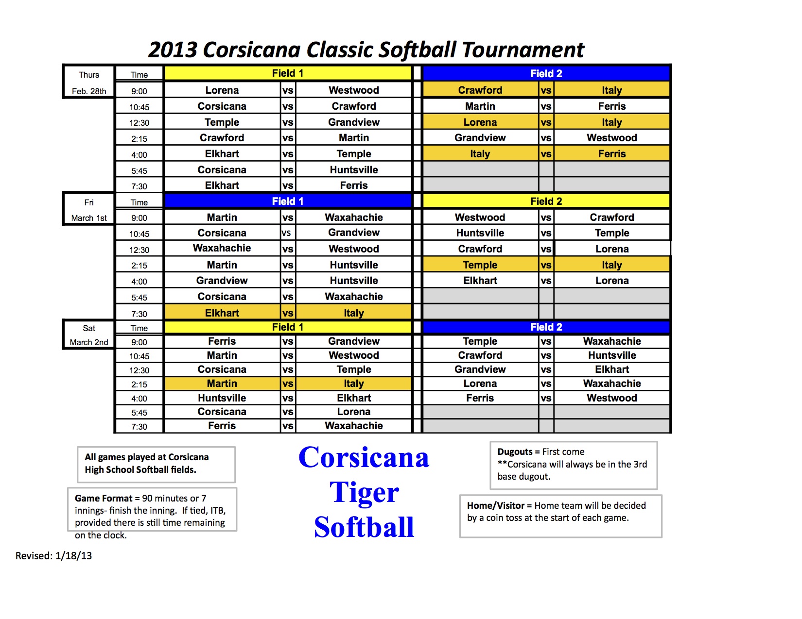 Lady Gladiators will travel to Corsicana High School for softball tournament « previous story album next » The 2013 Corsicana Classic Softball Tournament schedule. The Italy Lady Gladiators will play three games on Thursday, two games on Friday and then one game on Saturday. (.) Download original photo