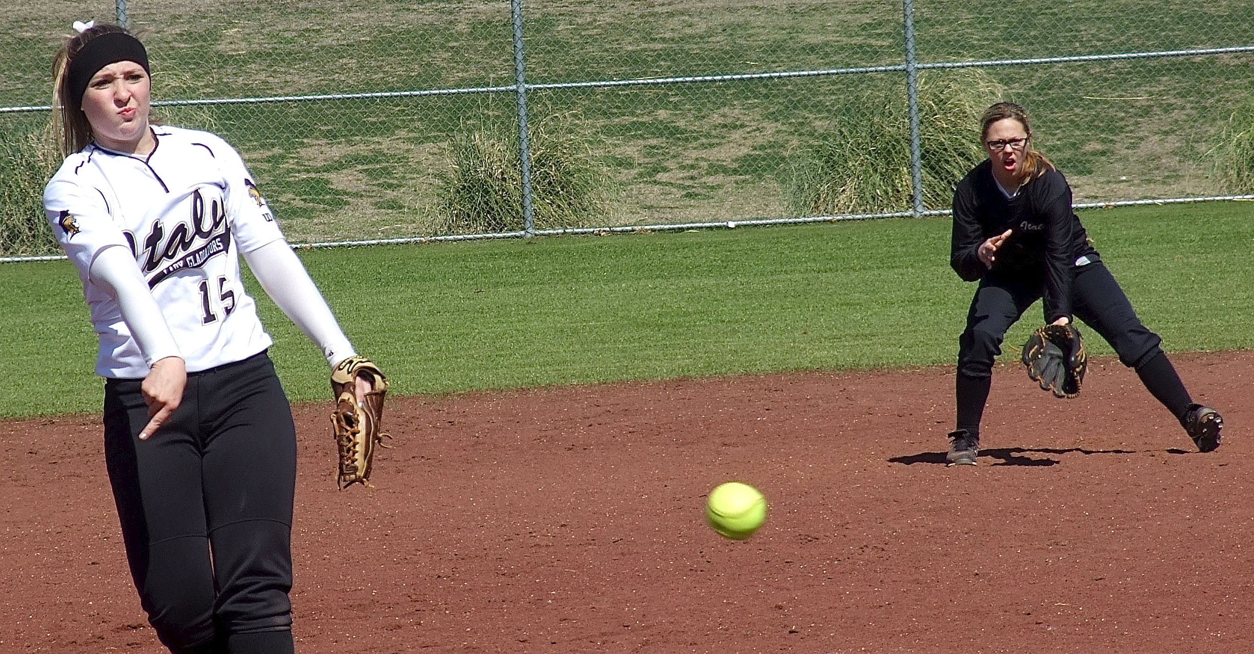 Lady Gladiators remain undefeated at 5-0 in district play midway thru the season « previous story album next » Jaclynn Lewis pitches while second baseman Bailey Eubank has her back. (Barry Byers) Download original photo