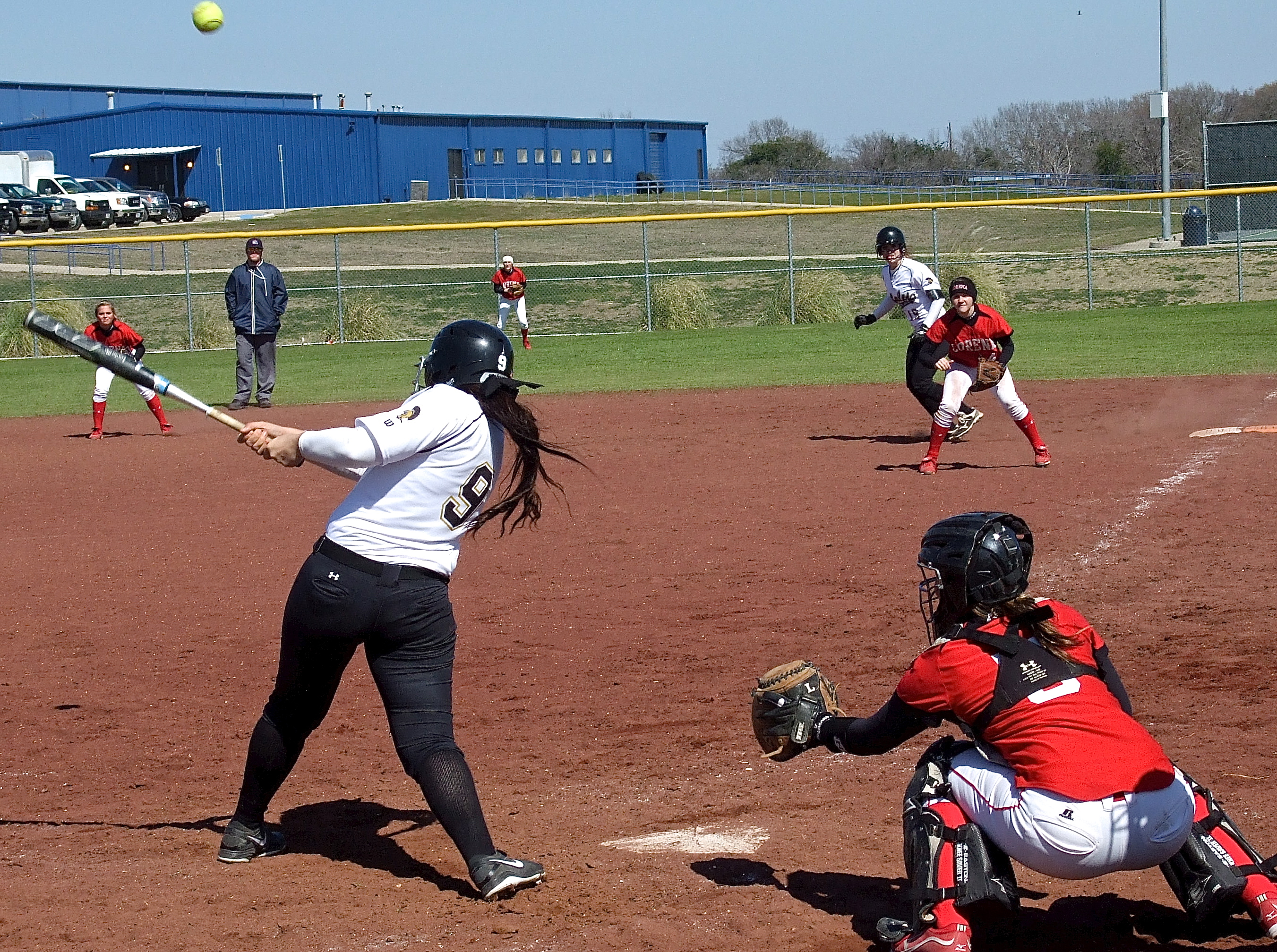Lady Gladiators remain undefeated at 5-0 in district play midway thru the season « previous story album next » With Jaclynn Lewis(15) on base, Alyssa Richards(9) sends a shot into the outfield against Lorena. (Barry Byers) Download original photo